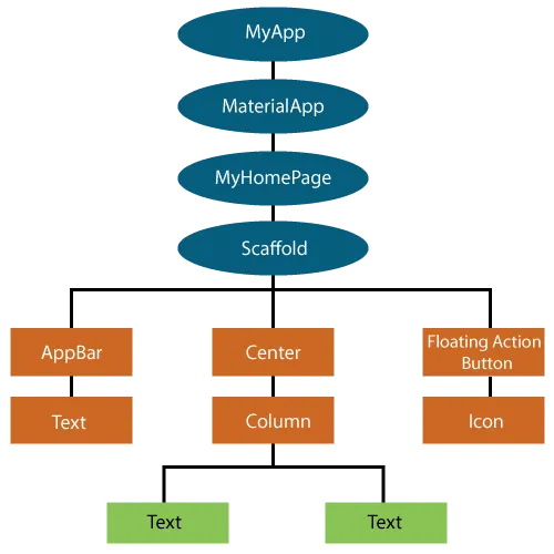 In the widget tree there is parent child relationship. Some widgets act as a parent and some behaves as child widgets. In the above picture we can see that the MaterialApp is the parent widget and all other widgets are its child widgets. There can also be a nested parent child relationship.