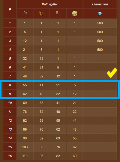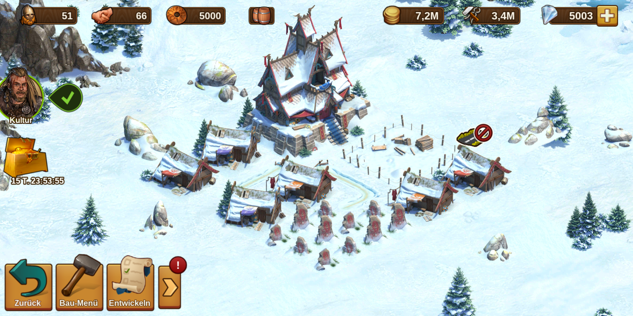 20 Sammle 2500 Kupfermünzen und Sammle 10 von jedem Gut - Fläche:84 Dauer: 8h(1Klanhaus, 1Hütte,1Axtschmied,1Met-Brauerei, 1Bestienjäger,1Wollfarm,1Met-Halle)
