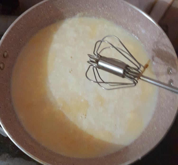 এরপর একটি ঘুটনির সাহায্যে ভালোভাবে ঘুটে নিতে হবে সব উপকরণ।সব ভালোভাবে যাতে মিশে যায় এবং উপরে যাতে ফেনা তৈরি হয় সেদিকে লক্ষ্য রাখতে হবে।