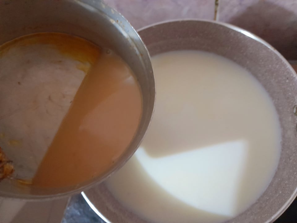 এরপর দুধের পাত্র থেকে অল্প পরিমাণে দুধ ক্যারামেল এর উপর দিয়ে দিলাম। এরপর ভালোভাবে ওই দুধটুকুর সাথে ক্যারামেল মিশিয়ে নিলাম। এরপর ওই ক্যারামেল এর সাথে মিশানো দুধটুকু, নরমাল দুধের উপর দিয়ে দিলাম এবং সব ভালো ভাবে একসাথে মিশিয়ে নিলাম।