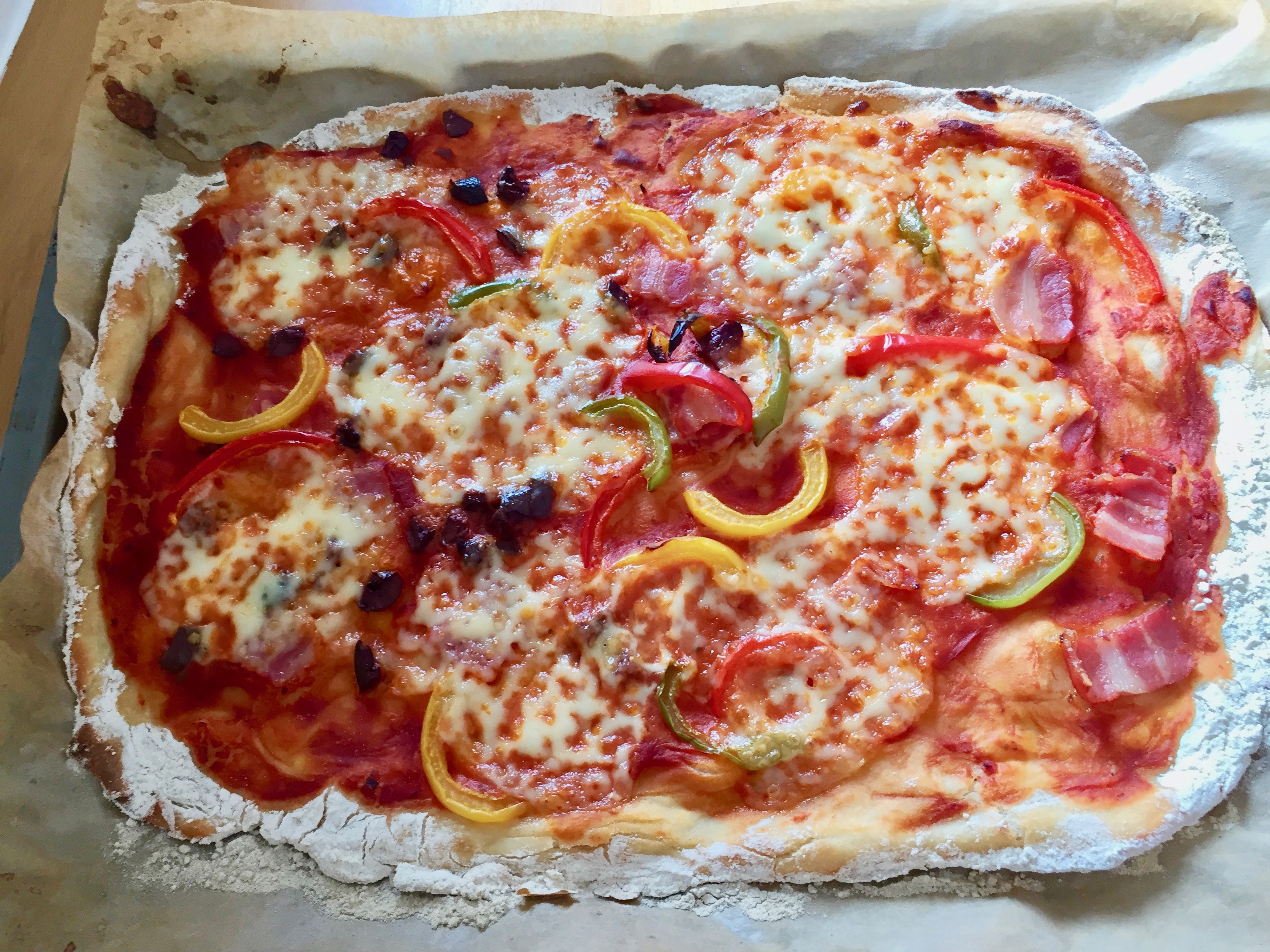 (Makes a 25cm x40cm pizza that you can cut into roughly 8 pieces as shown below)
