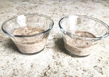 3 bananes congelées et des fèves de cacao. D'abord les bananes au robot culinaire pour mettre la consistance crémeuse puis ajouter les plumes de cacao et y aller. J'ai ajouté une goutte d'huile essentielle de lavande (toutes les huiles essentielles ne sont pas comestibles, à découvrir)