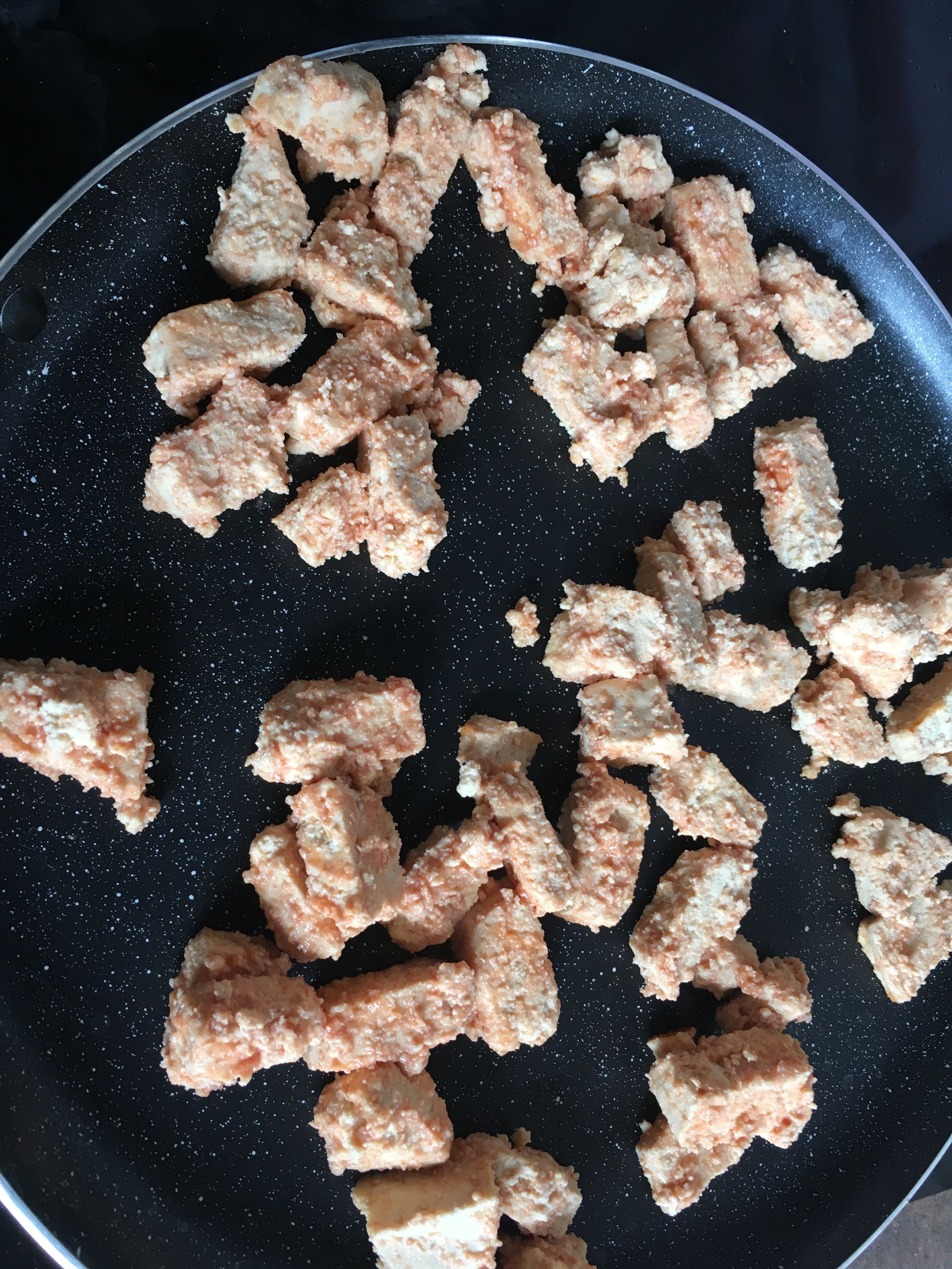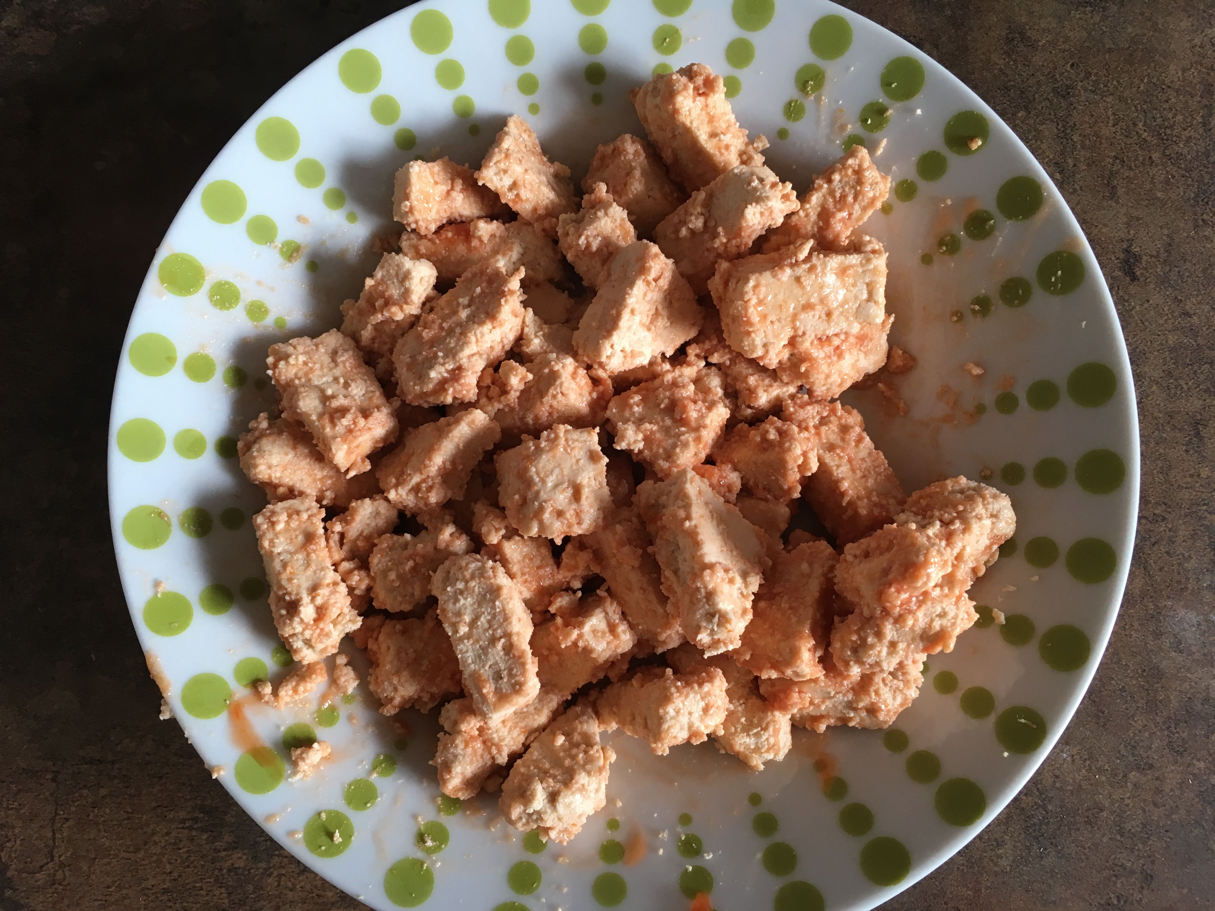 Une fois que vous avez terminé de juger ce pauvre morceau de tofu, vous le coupez en dèèèès (ou comme je l’ai fait, vous le coupez en cubes-chelou-moches-t’as-vu)