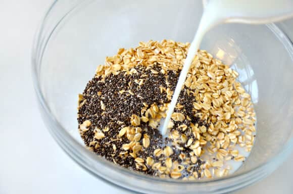 Mix 4 tbsp oats with 1 tbsp chia seeds and 100 ml milk.