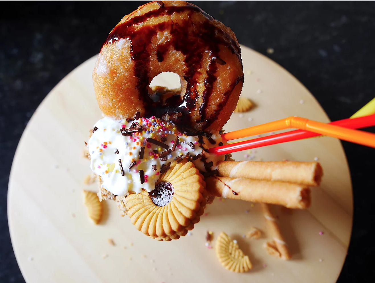 Freakshakes are an over indulgent treat all the way from Australia. They crossed the globe in 2015 and have been becoming more and more overloaded since. For the uninitiated, they are simple a milkshake topped with cream, cake and sauce. This Vanilla freakshake has a giant donut for extra show.