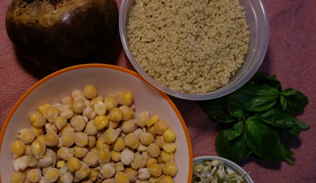 Red Beet, Chickpeas and Toasted Quinoa with Basil Avocado Pesto and Homegrown Mung Bean Sprouts