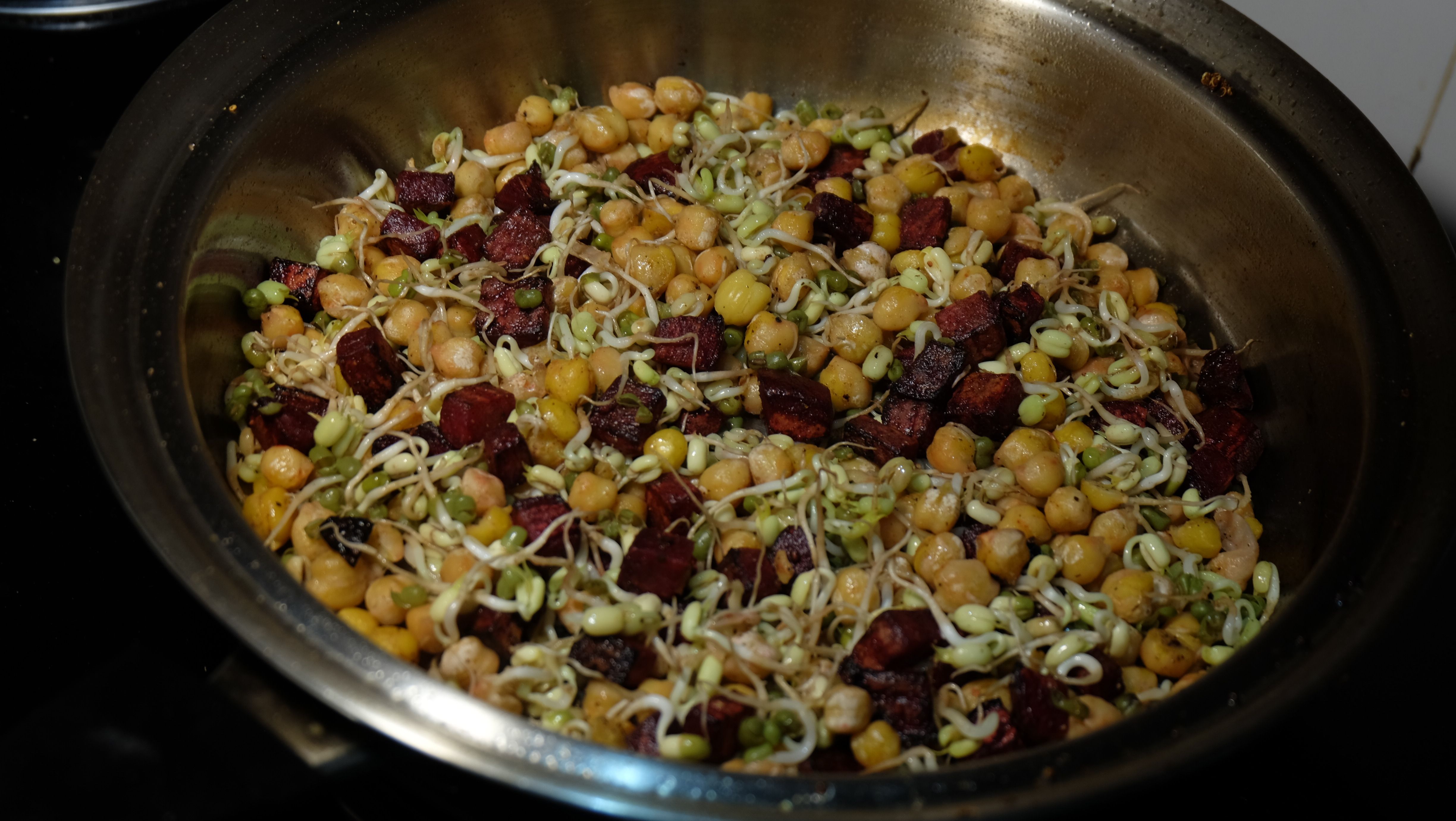 Made this simple dish with the fresh mung beans we sprouted the other day. These long, delicious white sprouts are ubiquitous in Asian cooking, but almost never make it to western cuisine! A real shame since they are so delicious, nutritious, and incredibly easy to sprout!
