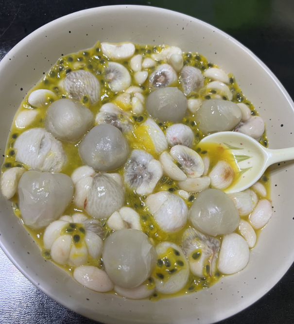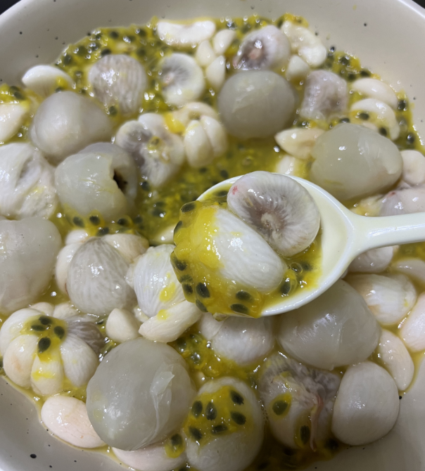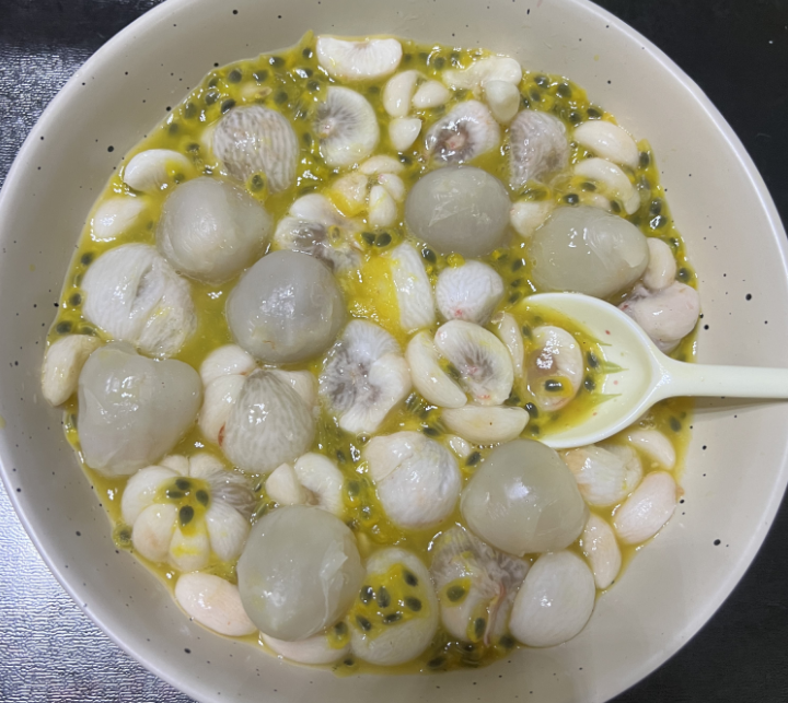 这几种水果分别是:荔枝、百香果、山竹。如果你手边还有蓝莓的话,也可以放进去,“颜值”会比我这好看些增加观感。