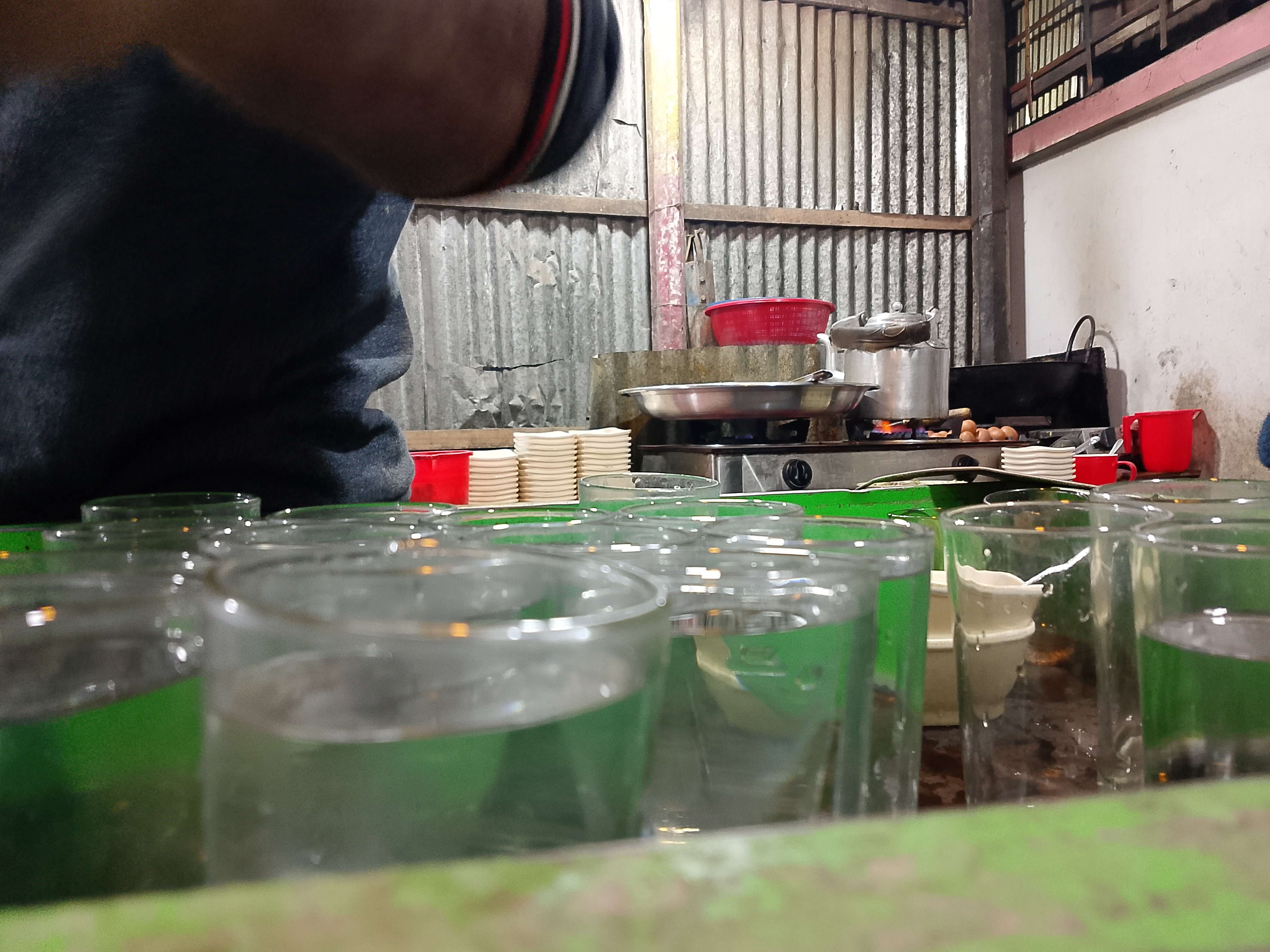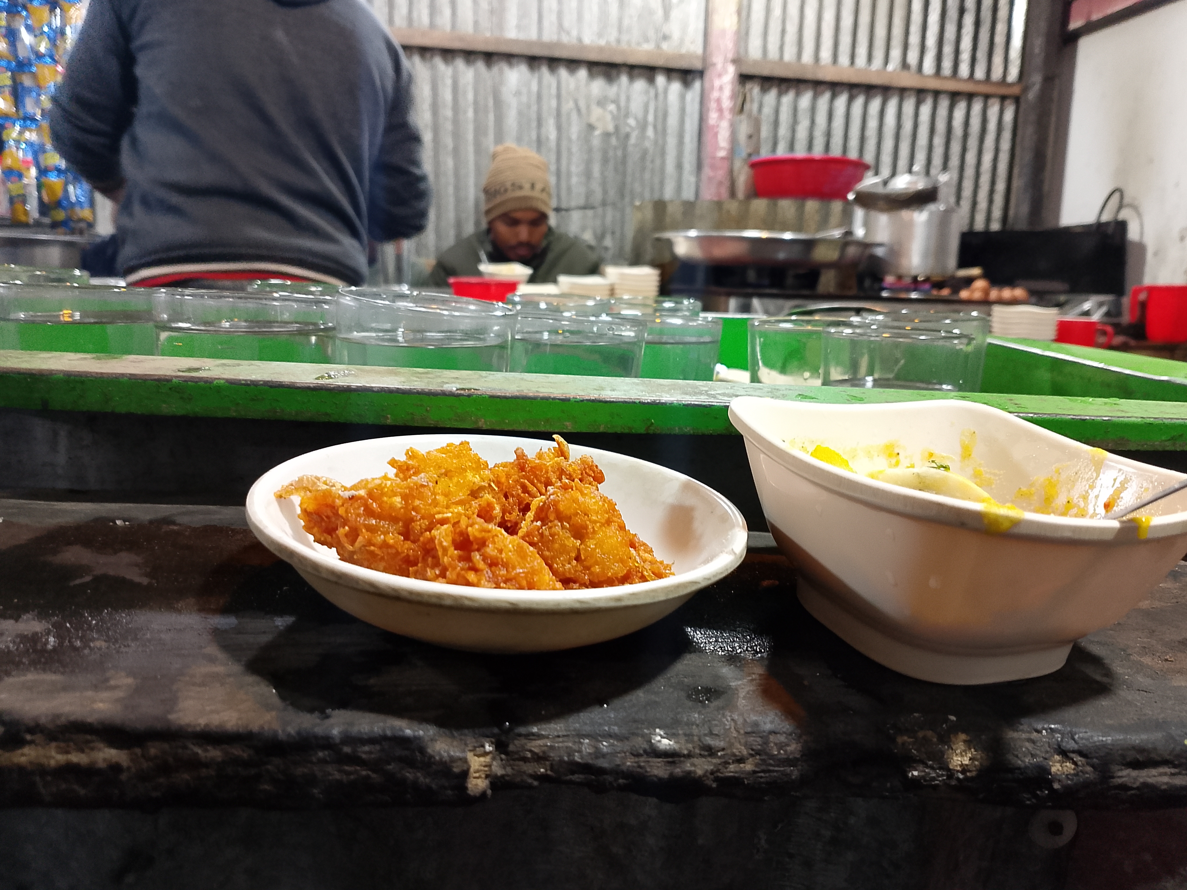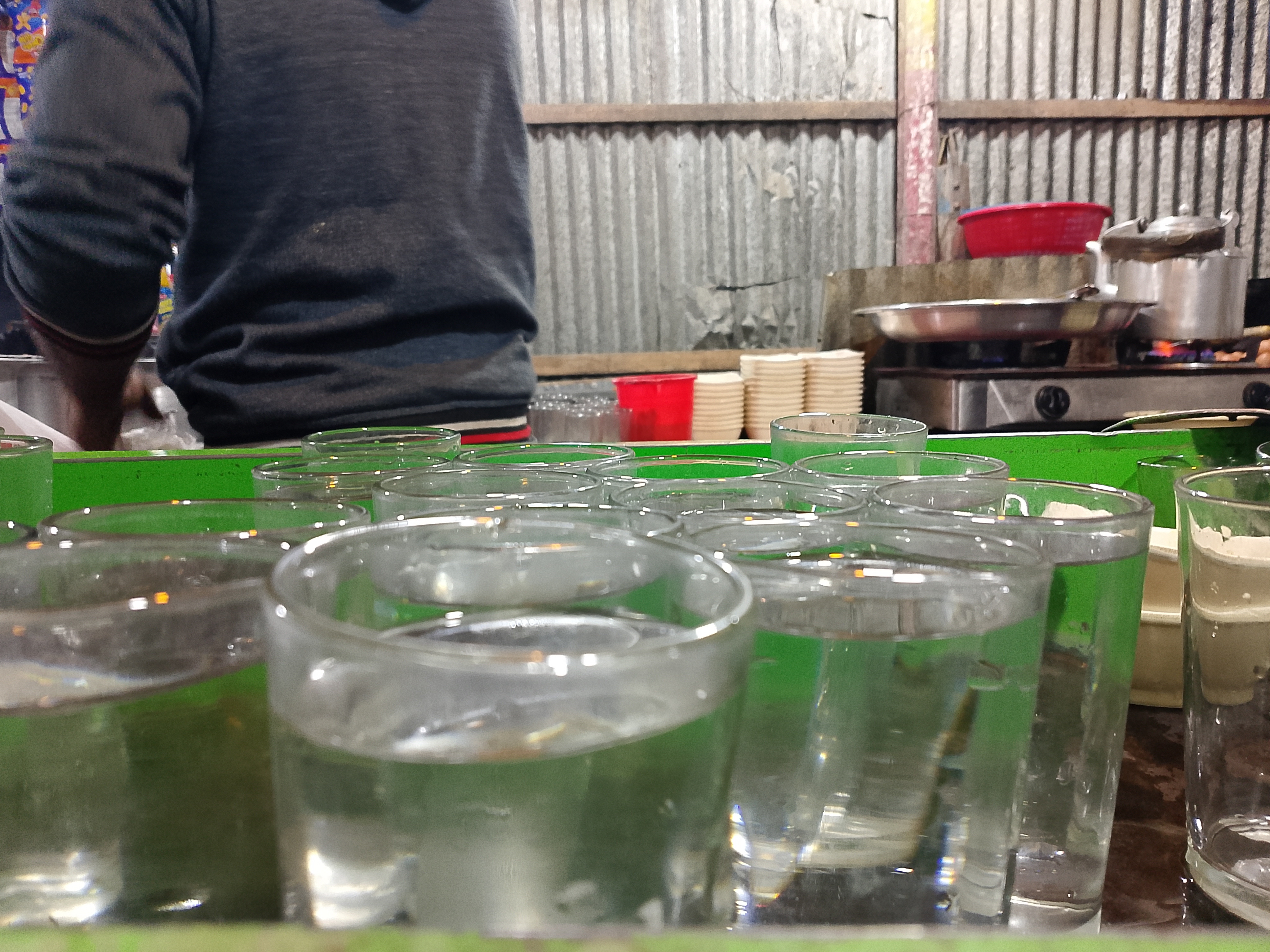 This is a small tea shop in the market, but even though the shop is small, the sales are quite good because delicious and satisfying food is available here. The food gets sold out quickly, and you need to wait in line to order. My elder brother and I went there to have tea and snacks. We went inside and ordered some snacks. However, we noticed that there was a delay in serving. From the place where we were sitting, we could see the glasses of water being prepared.