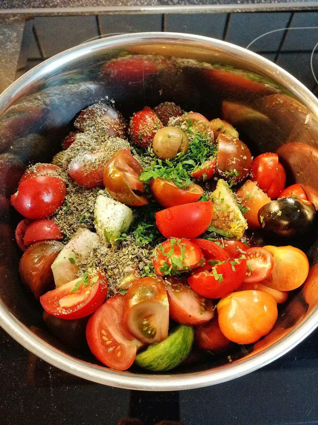 Würzen mit Salz, Pfeffer/Chili/Peperoni nach Geschmack, Rosmarin, Thymian, Salbei, Bohnenkraut, Majoran, Oregano, Basilikum, Petersilie, etwas brauner Zucker. Köcheln bis die Tomaten weich sind.