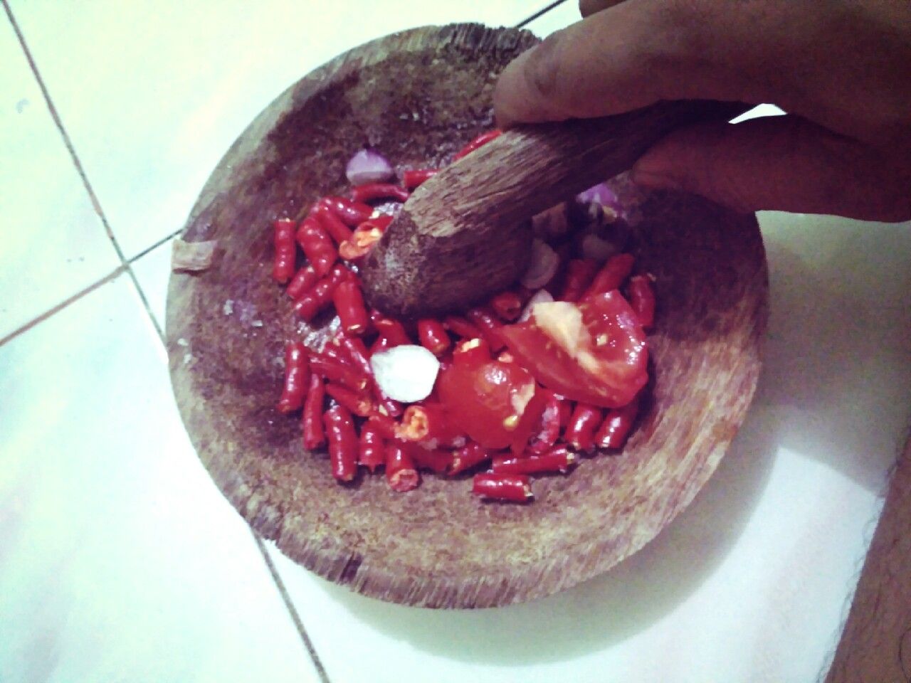 Pilih Cabai yang masih segar potong potong kecil, kupas bawang merah dan putih tomat, kemudian dihaluskan kesemua bumbu tersebut, tapi jangan menggunakan mesin penggiling (Blender) tapi harus menggukan ulekan ataupun gilingan, dimana hasilnya akan lebih nikmat dan memuaskan daei pada menggunkan mesin.