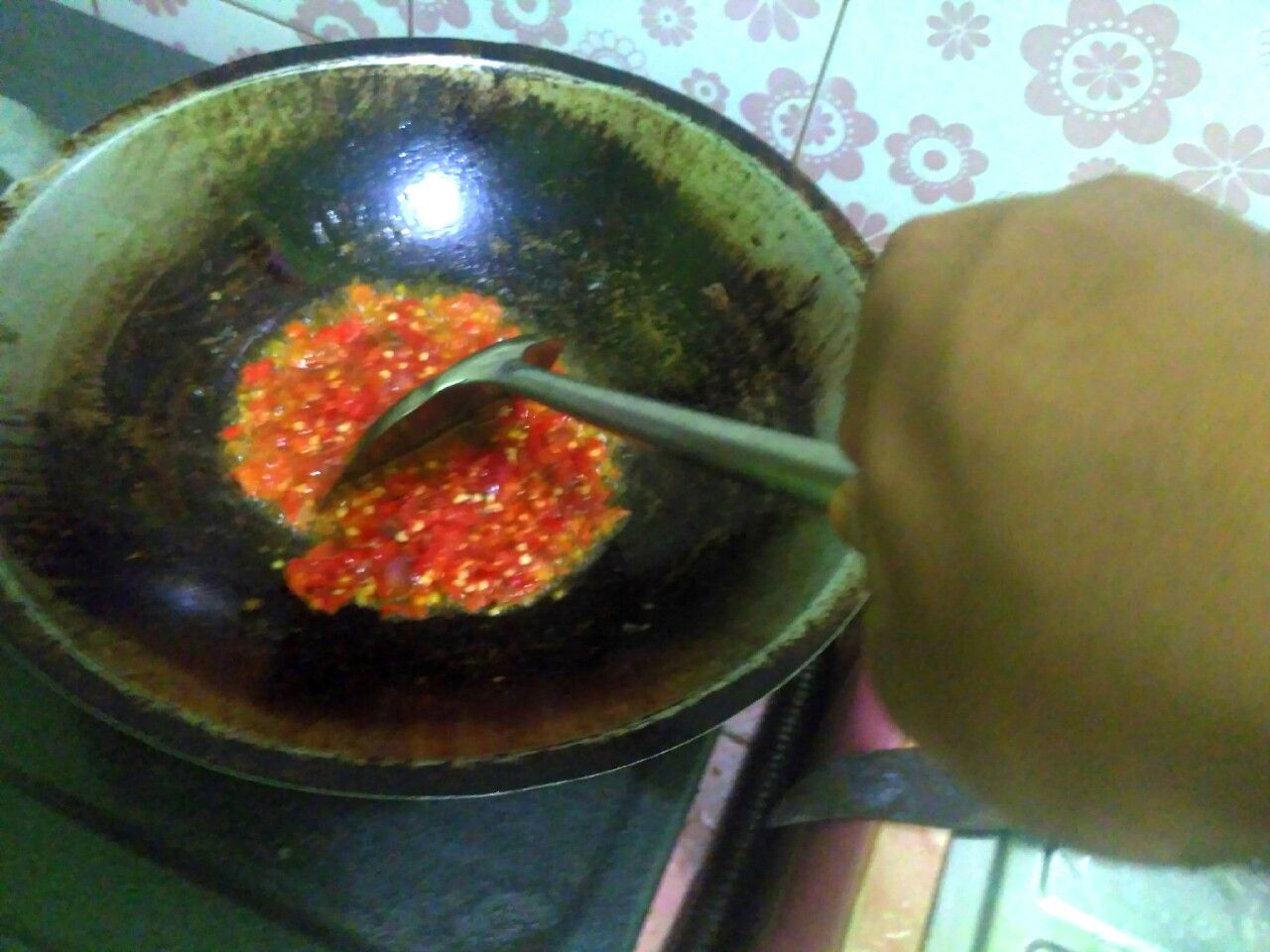 Panaskan minyak goreng, kemudian masukan bumbu yang sudah halus masak hingga matang atau berwarna kecoklat coklatan, setelah itu tambahkan air sedikit, masak hingga matang cabainya.