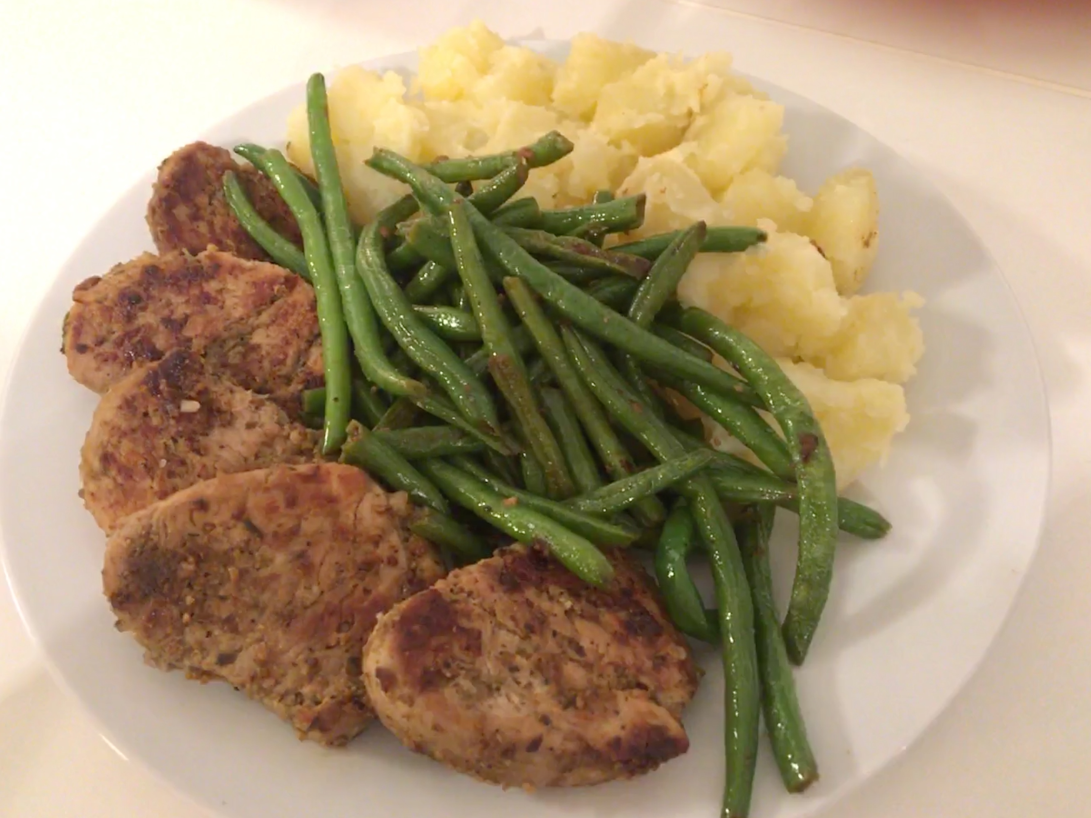 This one is always tasty and simple in case you are running late from work - yellow peas soup with frankfurter flavoured with bacon skin and marinated garlic pork slices with green beans and buttered potatoes.