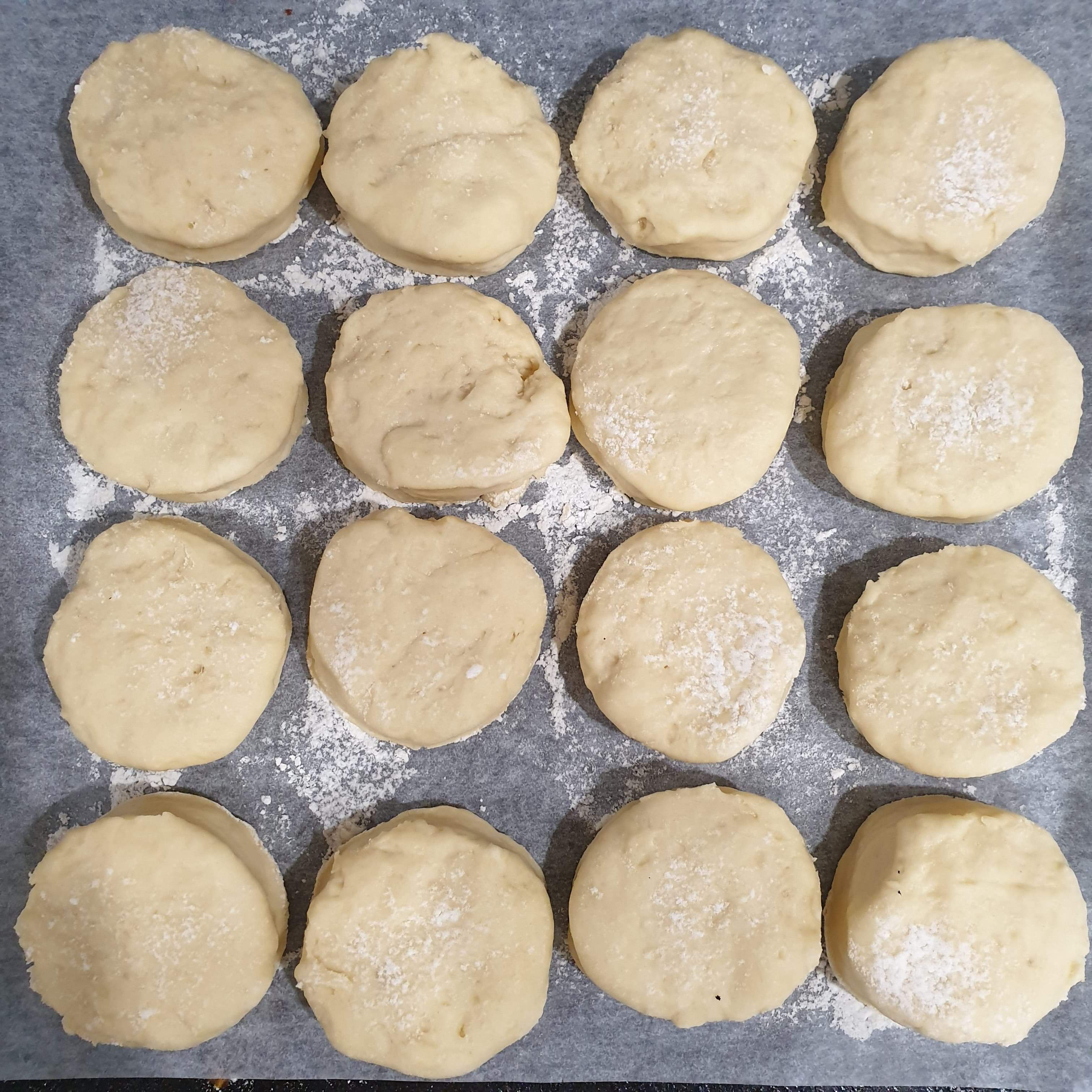 Using a 5cm round cutter, cut and transfer onto prepared tray 1cm apart.