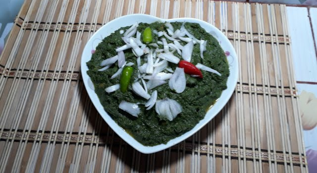In a pressure cooker put kumra leaf and prawns. Add ginger pieces, onion and green chili. Cook it. Remove and after getting room temperature in a blender make it pasted. Then take a fry pan, add oil. Fry onion, garlic and red chilli. Put the paste. Fry untill the oil comes up.