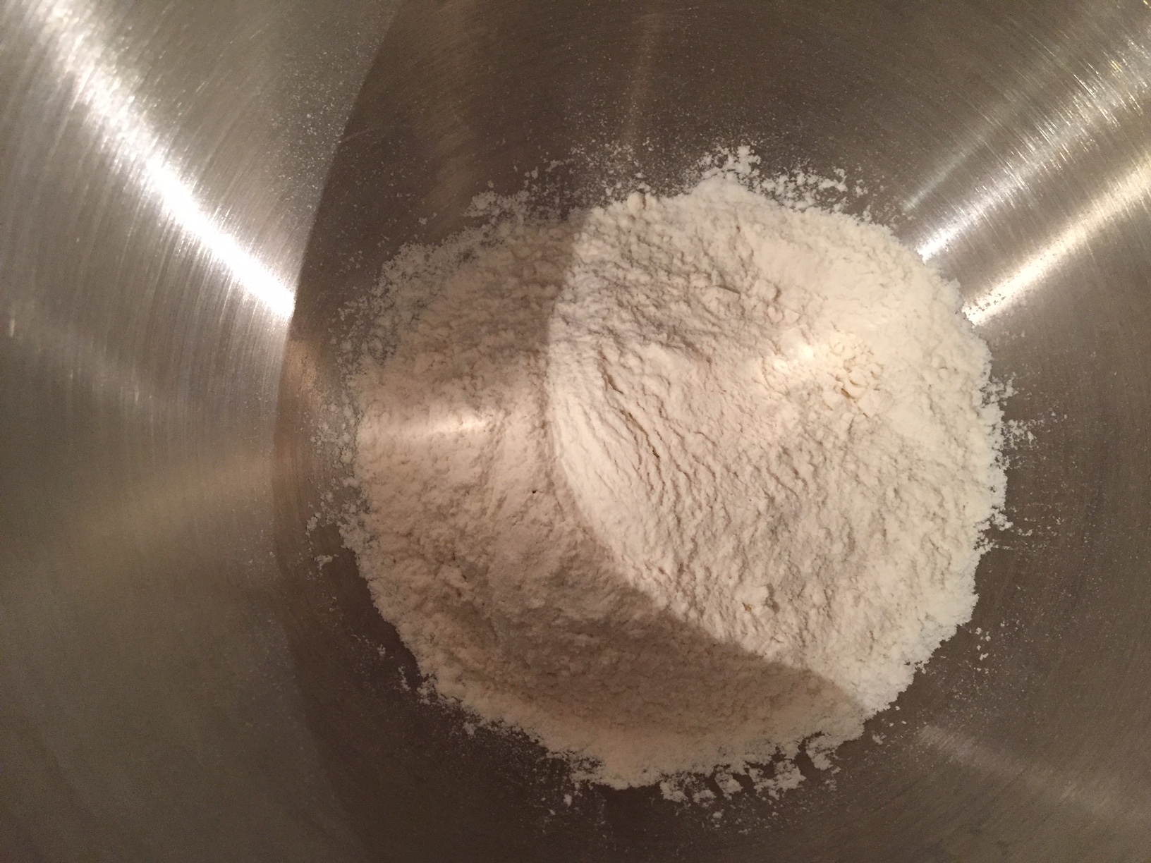 - In a large bowl place the flour, sugar and pinch of salt.