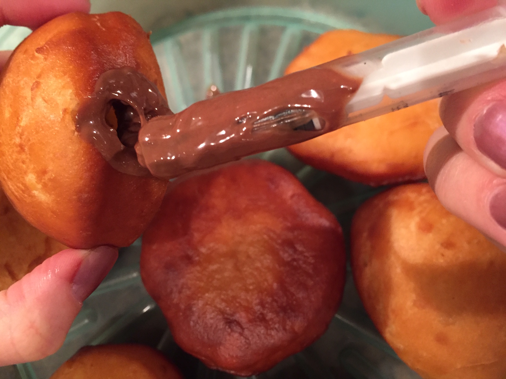 - With the help of a small injector, we will make a hole in each pump and fill them with nutella.