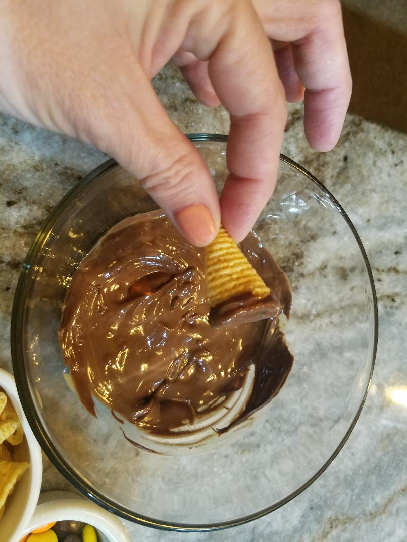 I then decided to melt the chocolate morsels, peanut butter and a tad of coconut oil in the microwave. The coconut oil helps the chocolate melt better and therefore it doesn’t harden or scorch as easy. Just in case you are wondering, I melted the chocolate about a minute and a half. This should be what is looks like when melted.