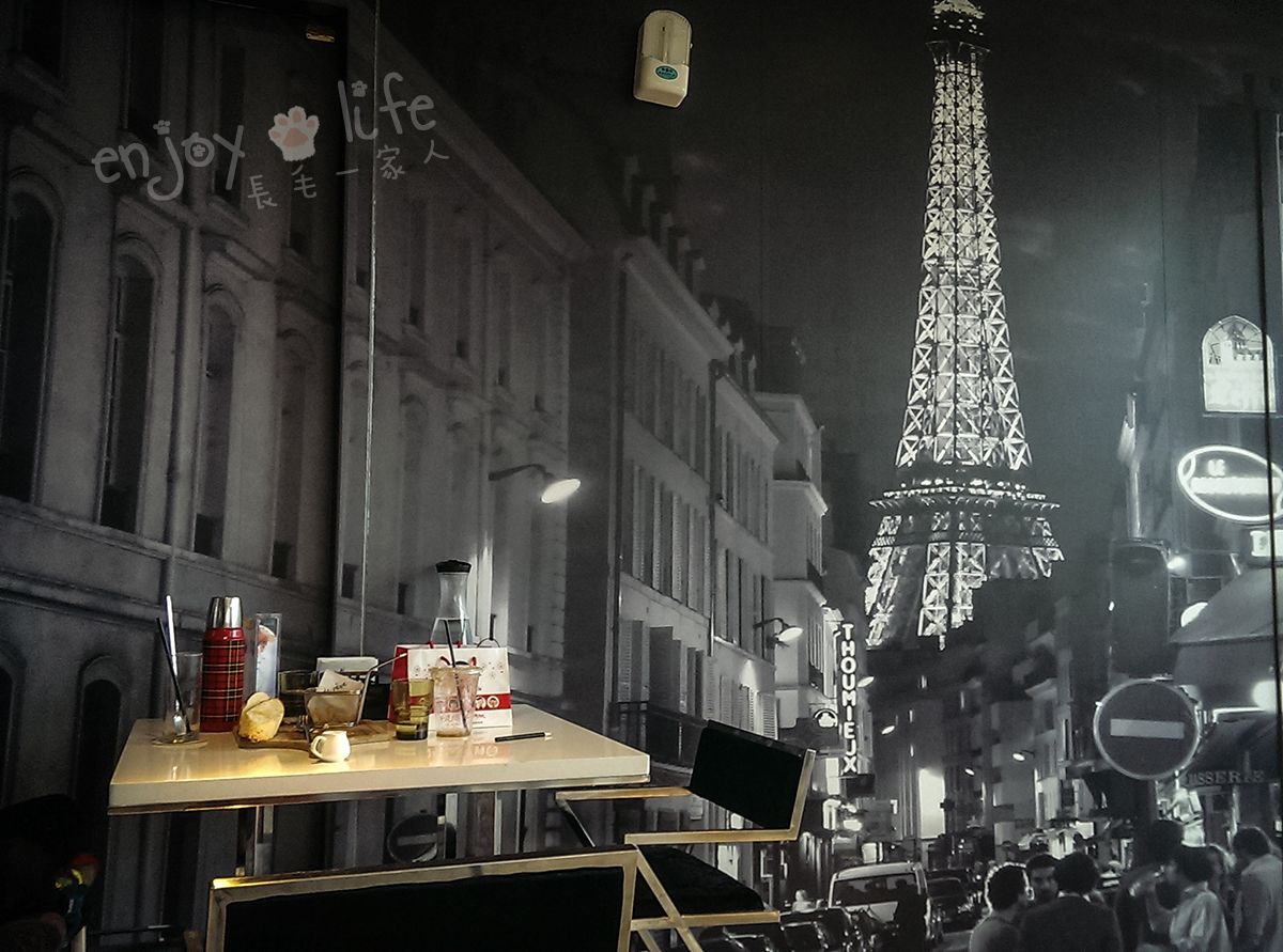 餐廳中有一整面牆,設計成巴黎的街景,黑白的照片,把牆面妝點得看起來很有文藝氣質。