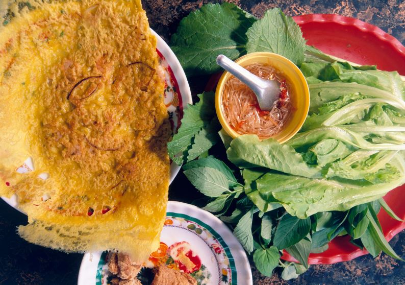 These enormous, cheap and filling Vietnamese pancakes translate (banh xeo means “sizzling pancake”) pancake contain shrimp, pork, bean sprouts and egg, which is then fried, wrapped in rice paper with greens and dunked in a spicy sauce before eaten.