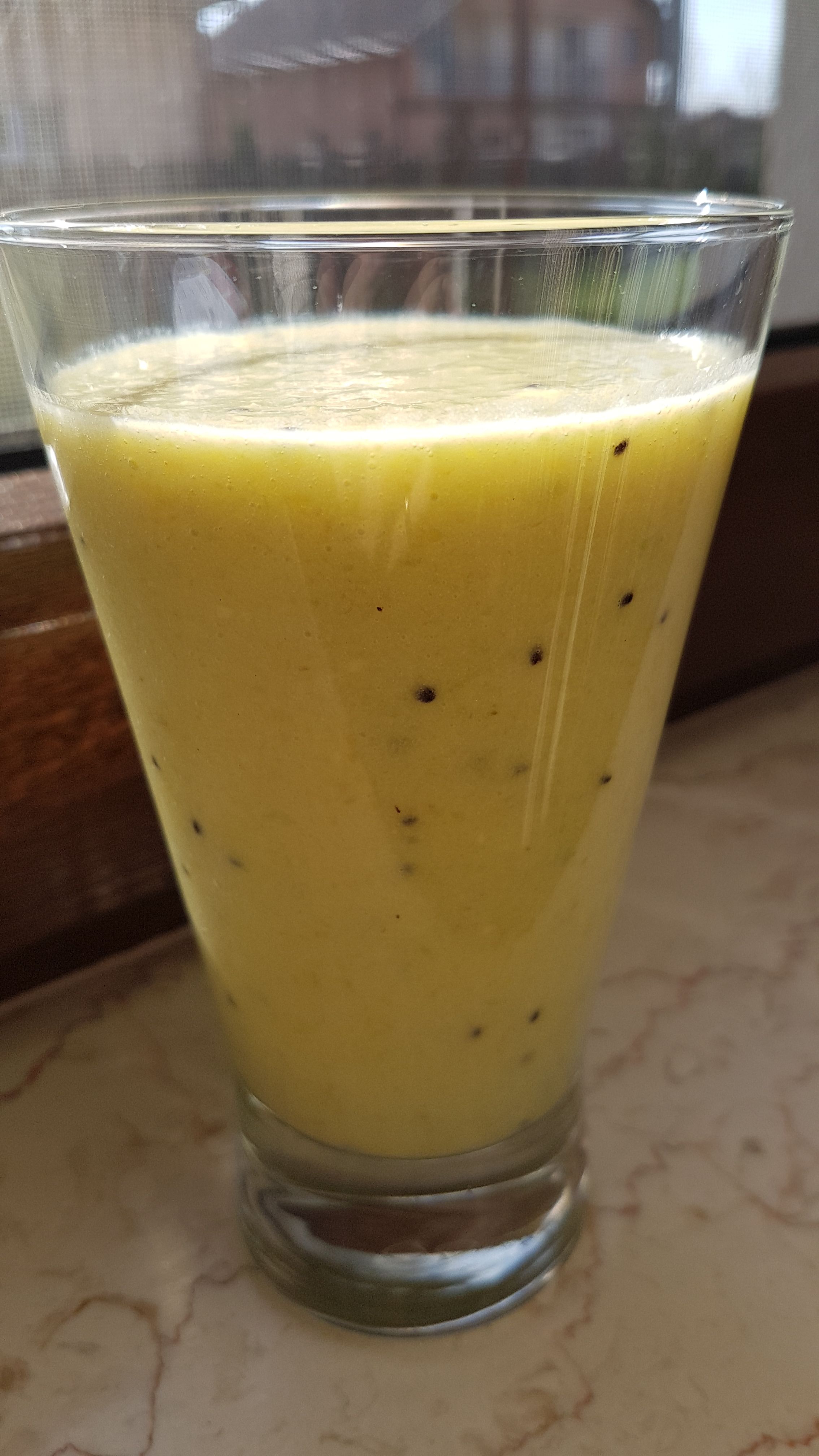And that's why I come today to present you an energizing and vitamin- smoothie. In this I put kiwi, banana, avocado, mango and as liquid I put soy milk. It was delicious!