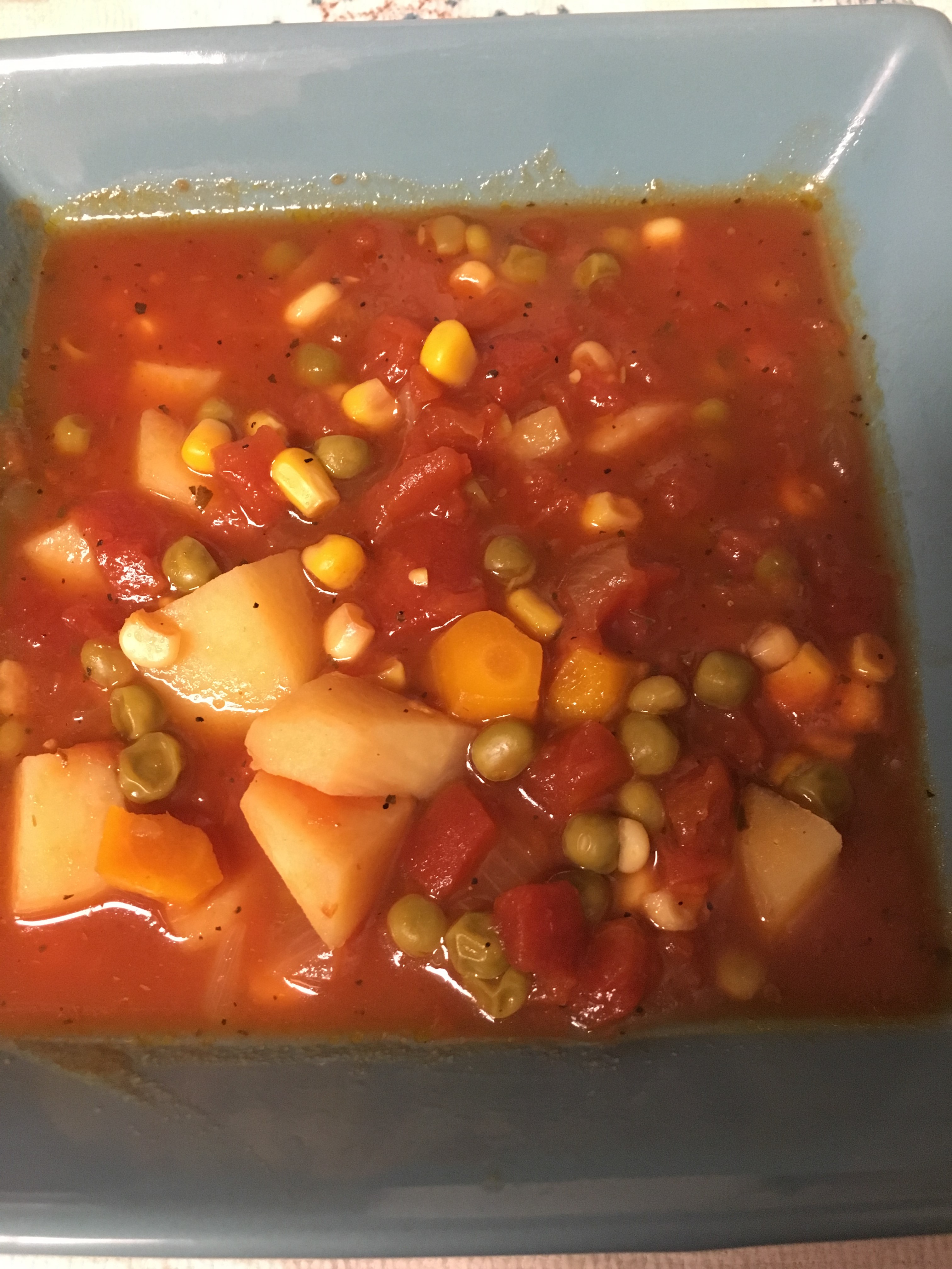 Dice up all the vegetables. Using a slow cooker place it to low heat for 6 hours or high for 4 hours. Place all the vegetables in the slow cooker and add all the ingredients, the chicken bouillon cubes or if you wanted do use the (onion soup mix add it instead of the chicken bouillon cubes. ) Add the water and the tomato sauce. Last, add the spices and the salt and pepper to taste. Let it cook and stir occasionally.
