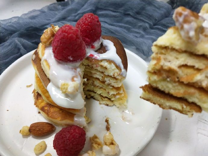 5、煎好的舒芙蕾叠4层摆放,倒上酸奶,撒上坚果及水果,可以开始享用啦~