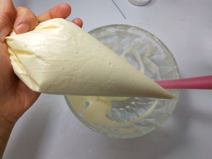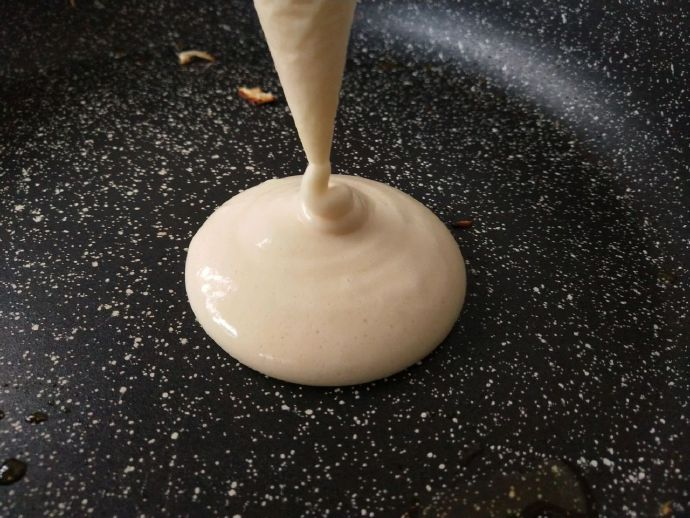 - Extrude the mixture from the base of the flower bag. The size of the palm can be turned. After 2 minutes, the surface can be turned over and the two sides become golden.