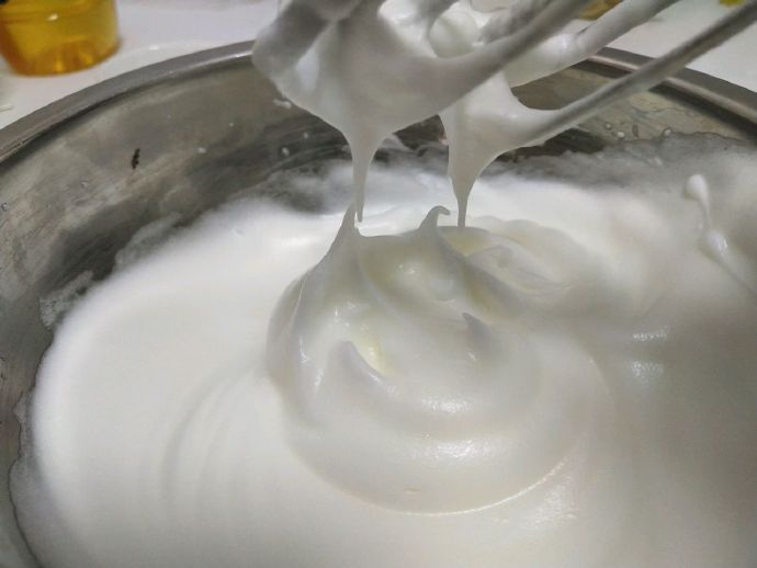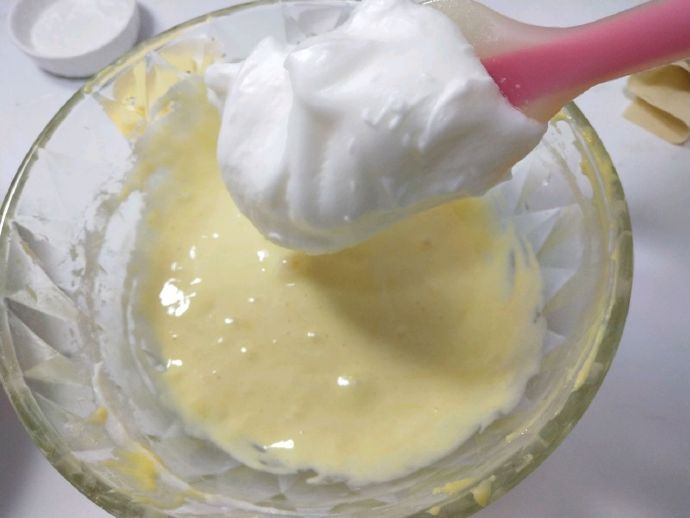 2, send egg whites, sugar is added in three times. Add the beaten egg white to the egg yolk mixture and divide it three times