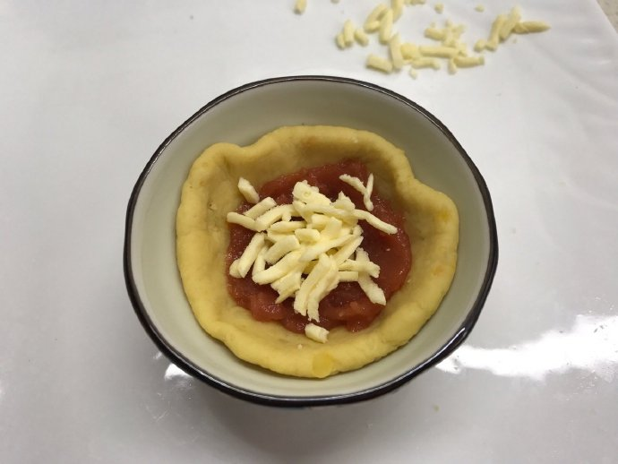 3, a dough of about 30g, pressed into a cake after rounding, use a spoon to apply a layer of hawthorn sauce on the cake surface, and then sprinkle the appropriate amount of cheese.