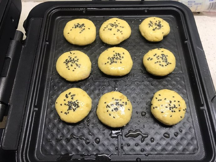5、电饼铛预热后抹油,放入做好的红薯饼,饼表面也抹一层油,盖上盖子,煎大概2分钟。