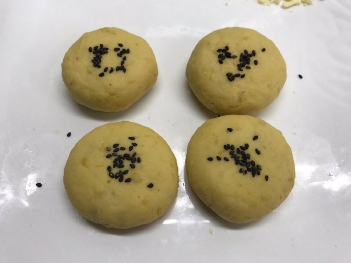 4, like the dumplings, the dough is gradually closed, rounded, sprinkled with sesame seeds on the surface and then squashed a little.
