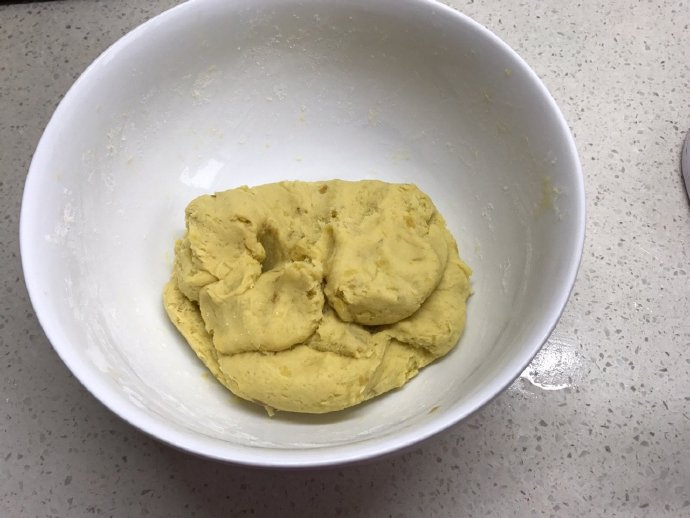 2、红薯泥中加入面粉,揉匀,揉好的面团比较柔软,不太粘手。