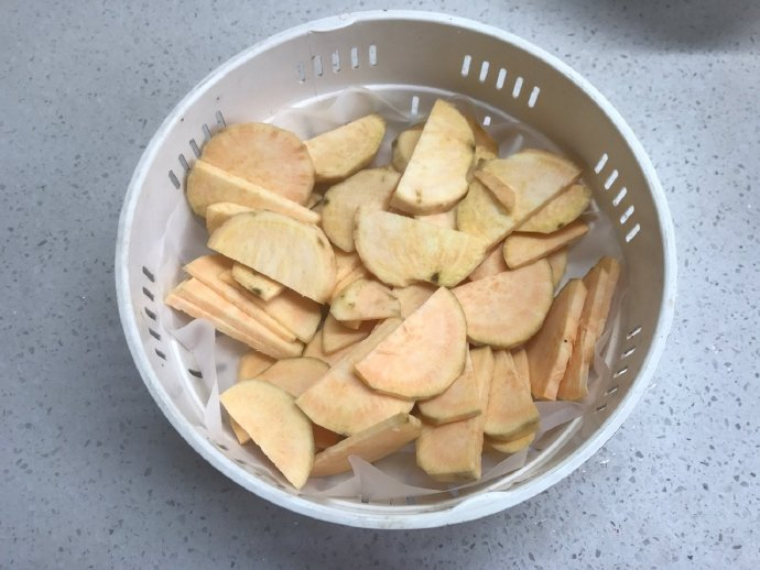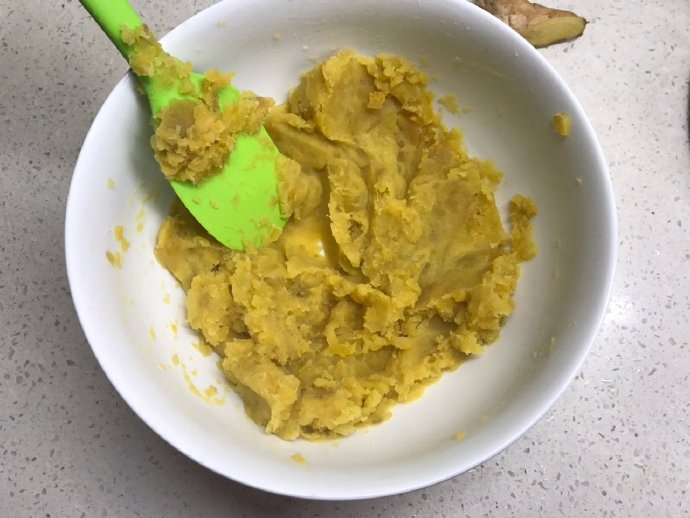 1、红薯切薄片,上锅蒸15分钟,至筷子轻易穿透的程度。蒸好的红薯,用铲子(或勺子、擀面杖)压碎,加入适量白糖,搅拌均匀。