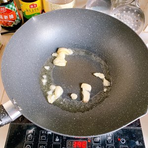Heat oil in pan, add garlic and stir fry with a wire whisk over medium heat. Be careful not to turn it too hot. Garlic will scorch and affect the taste.