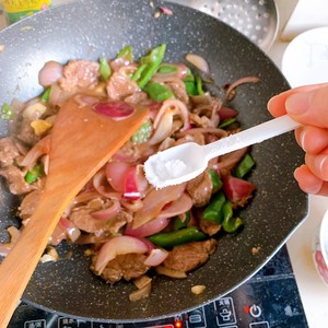 Stir-fry for about two minutes and add salt. Pour the cornstarch into the pan. The fire reaps juice ~