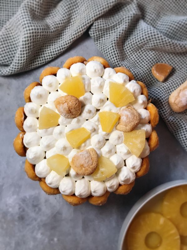Pour la déco : on utilise les chutes de biscuits, des morceaux d’ananas et une chantilly maison (25cl de crème liquide entière bien froide fouettée avec un peu de sucre glace et de poudre de vanille.)