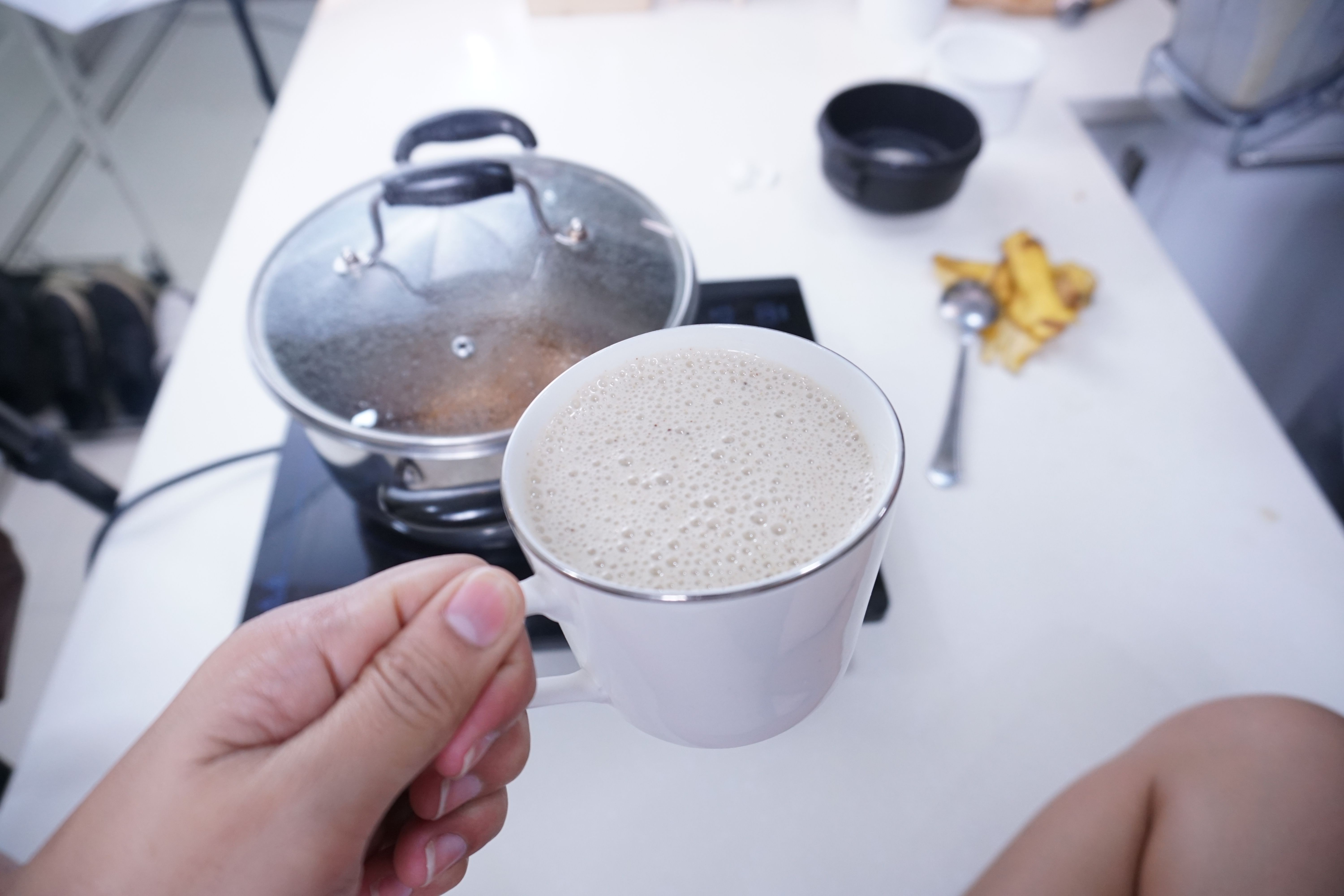 Having a cup of banana almond shake while shooting "Chicken Adobo"