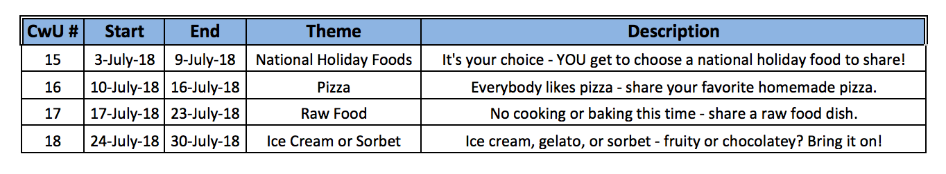 We have some exciting news to share with you. Please watch for the newsletter coming out on July 3rd to find out what's cooking. For now, let's go straight to the Week 15 theme.