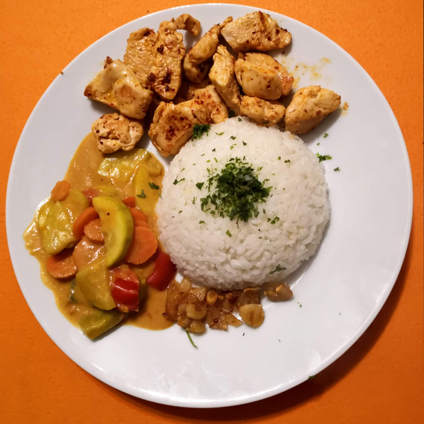 und etwas Petersilie. Als Beilage Zucchini,🥕 Karotten und Paprika mit 🥥Kokosmilch, eigener Chilisoße (🍍Ananas+Mango🥭),die ich mit dunklem