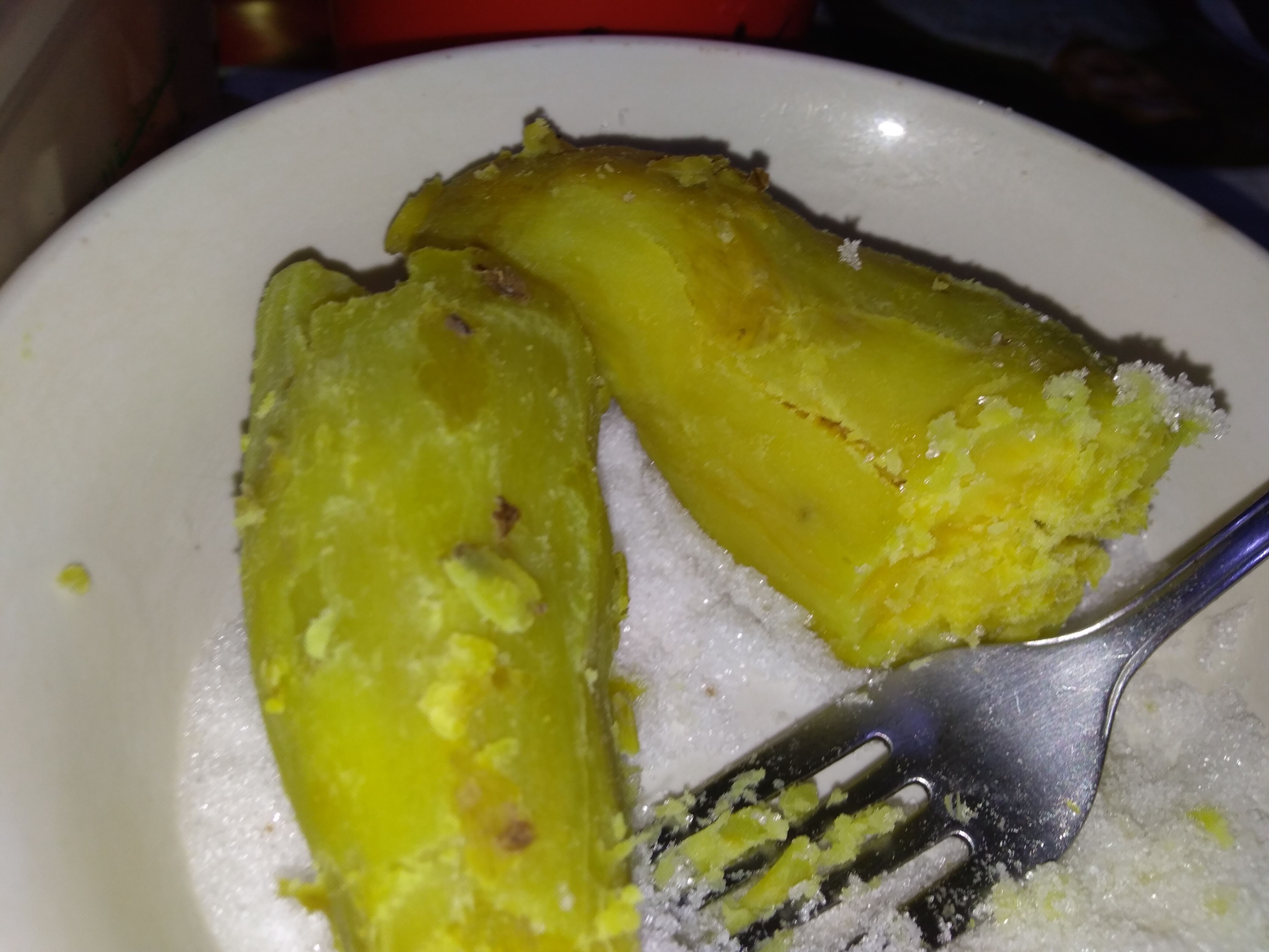 This is just a boiled sweet potato. Very good to eat if you do not have much food to eat. Iit provides a good carbohydrates and vitamin A and quite delicious. I just missed the orange variety with a plump and succulent vine and leaves because the varieties that I see today have a much thinner vine and a relatively tougher stem and leaves.