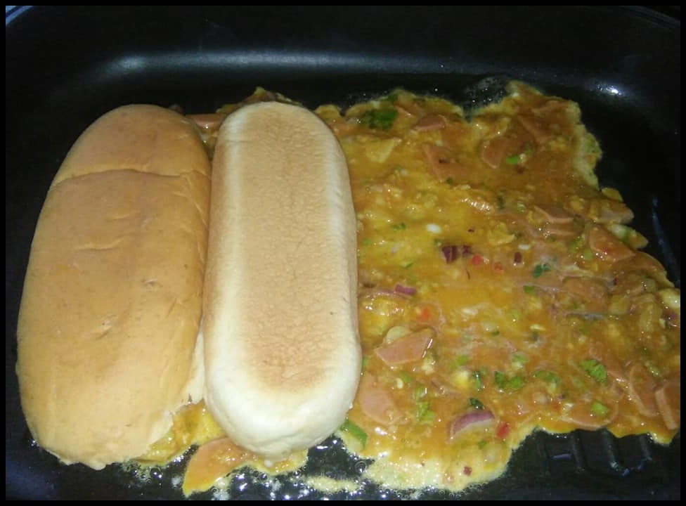 - Then enter into a pan or fryer over low heat then cut the bread into 2 parts and spread the bread part with butter or margarine, and put the side of the bread on the egg mixture (fill) that we have put on the frying pan.