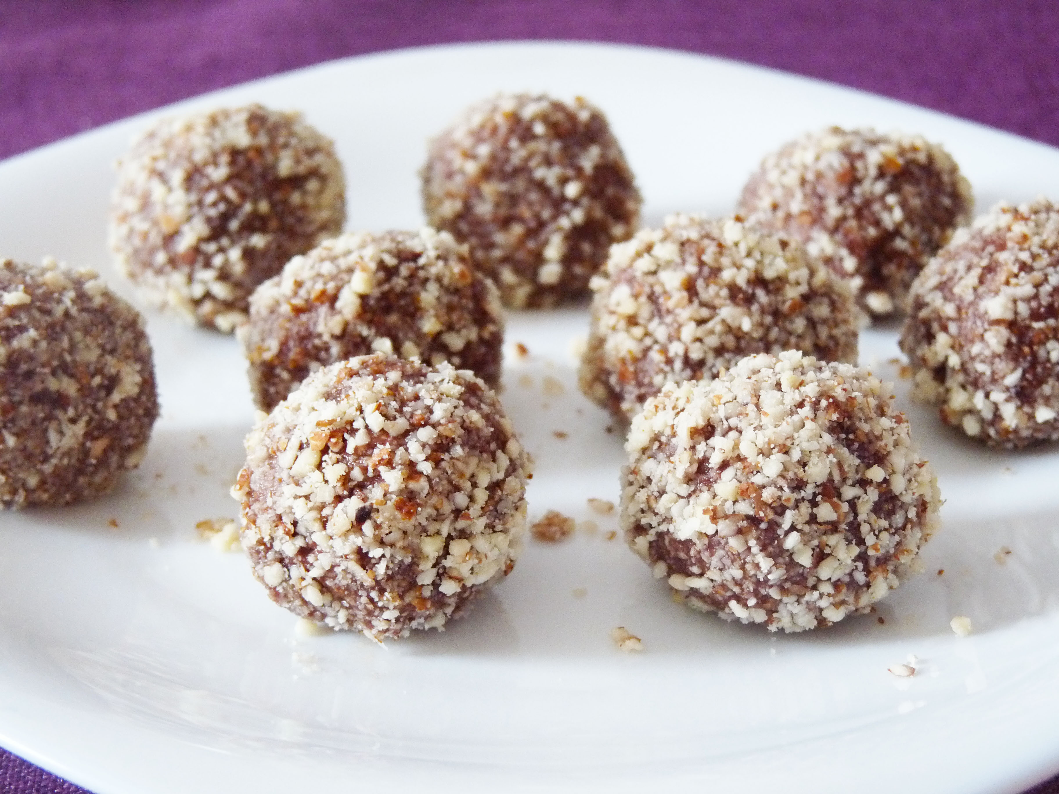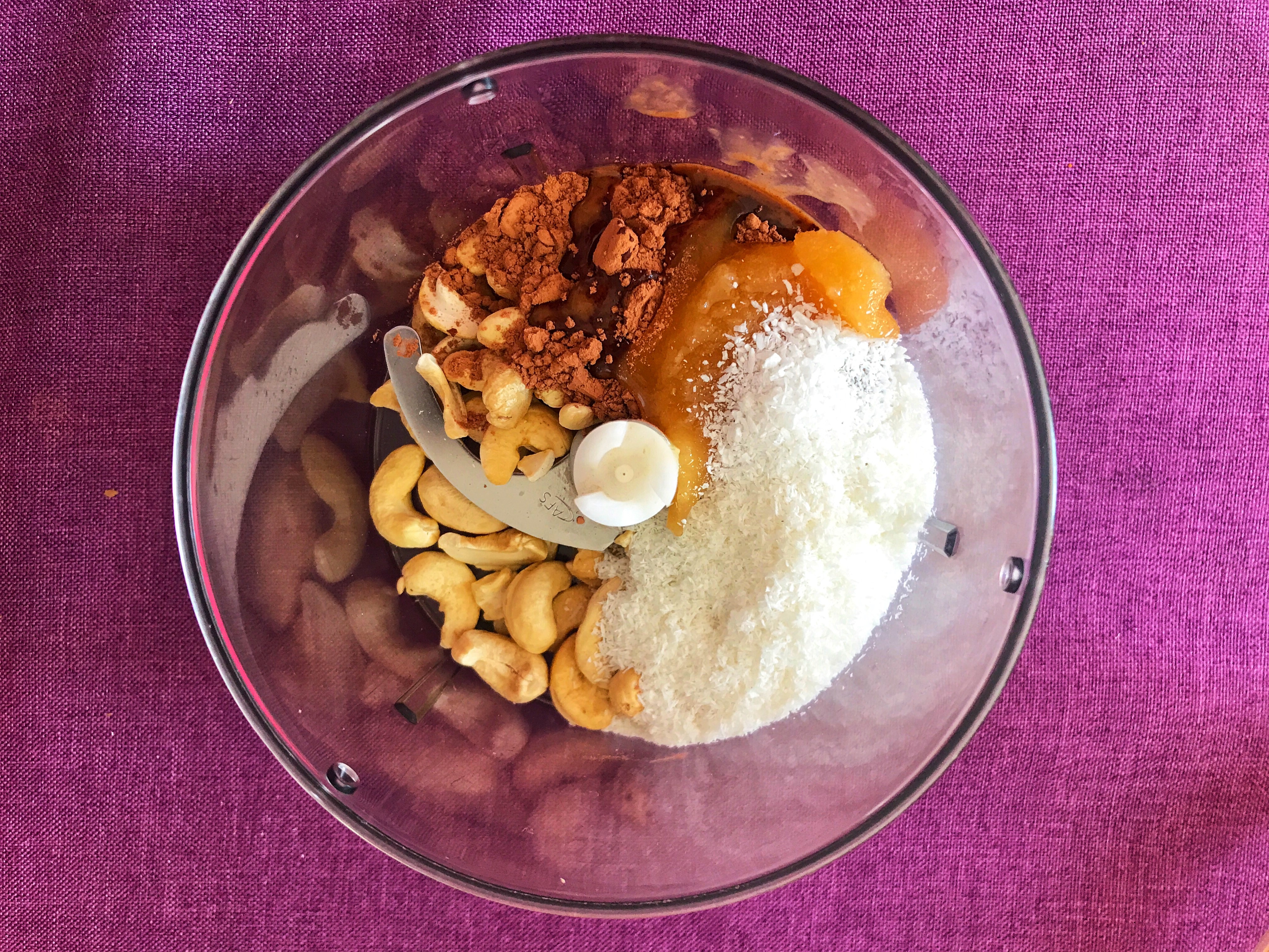 The dessert was candies made from cashew nuts, cacao powder, honey, hazelnut tahini, shredded coconut and coconut butter.