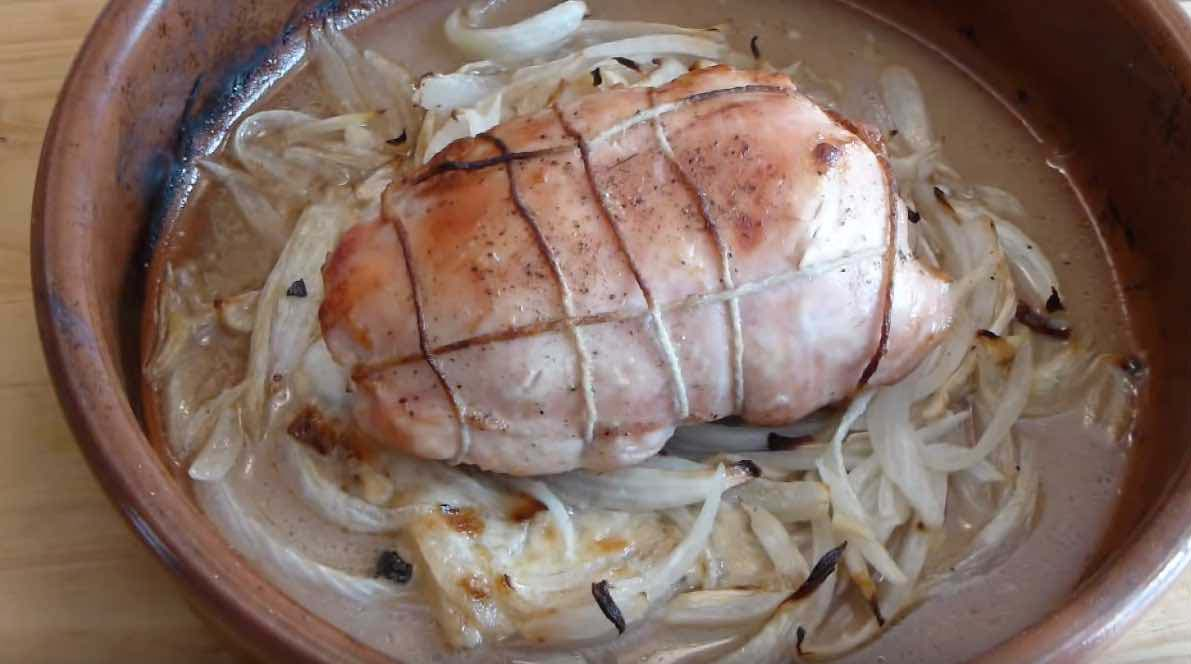 Ahora, coloque el pollo en una fuente para horno, donde se vierte un poco de vino blanco y cebolla picada antes de ponerlo en el horno a 190° C durante 55 minutos – o hasta que el pollo empiece a tomar un color dorado.