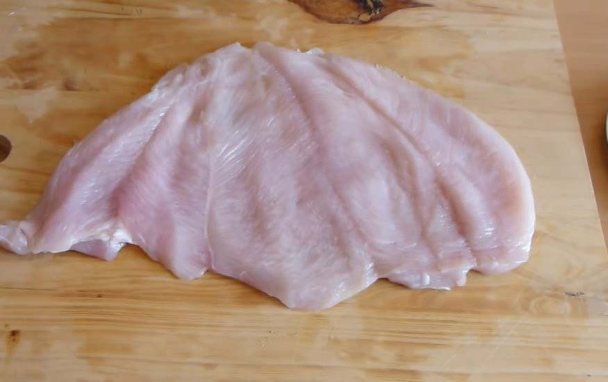 En primer lugar cortar la pechuga por la mitad con un cuchillo (lo que seria abrir la pechuga por la mitad) y colocar el pollo en una superficie plana.