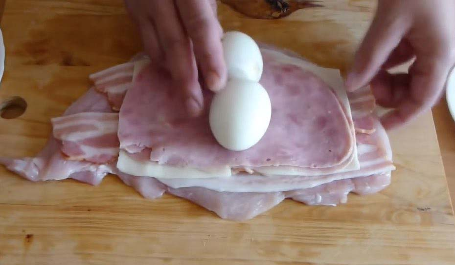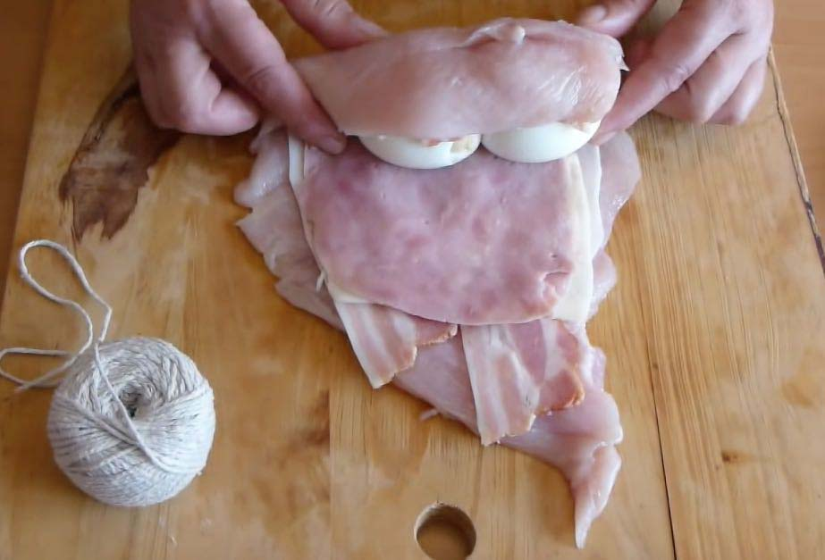 A continuación, enrollar, aunque con cuidado de que los huevos no se salgan por los lados. Atar todo el pollo (ver foto). Una vez que haya hecho esto se puede añadir un poco de condimento que desee.