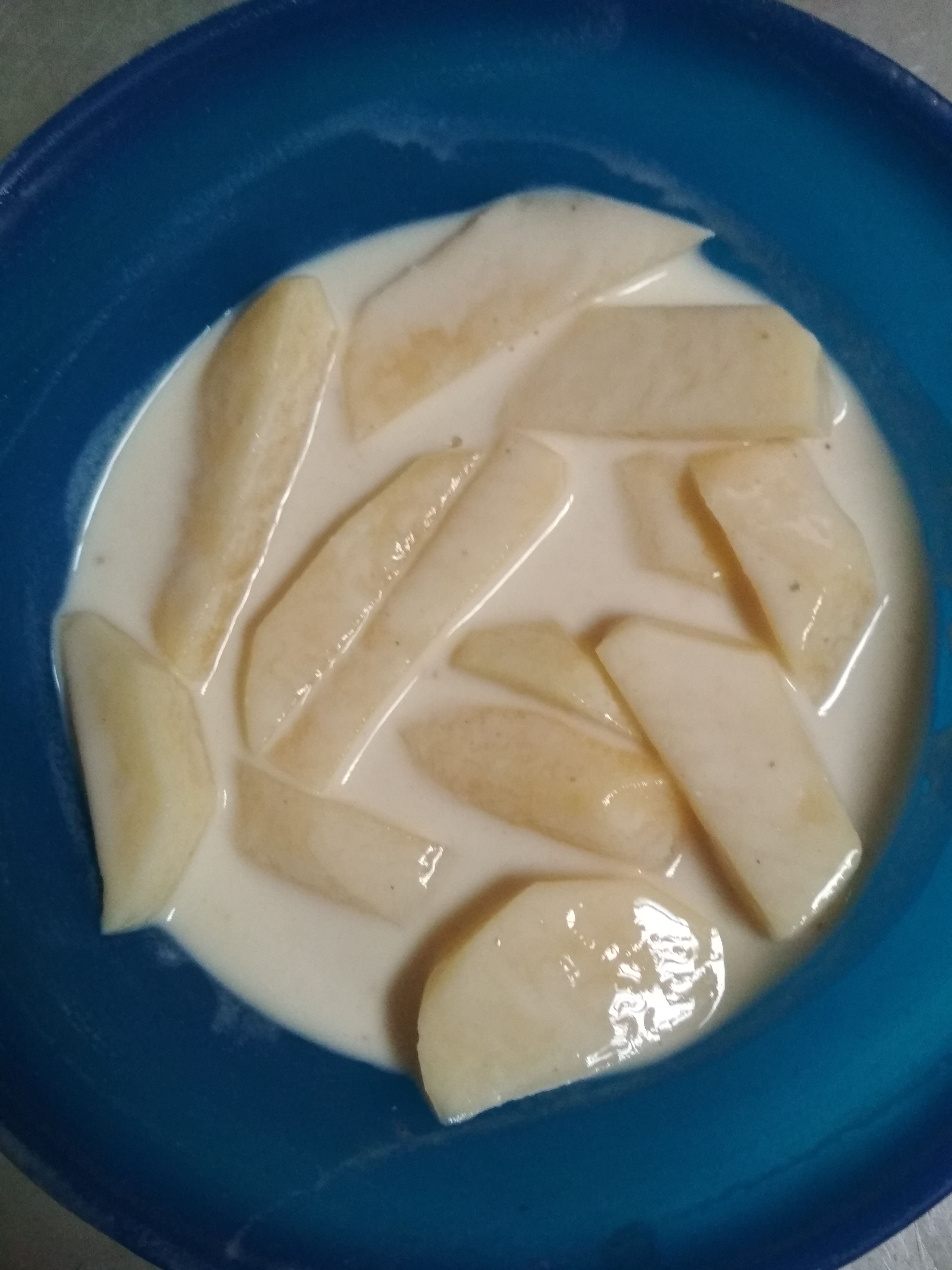 Langkahnya pertama-tama kupas kentang, kemudian masukkan sedikit air ketepung yg sudah disiapkan aduk sampai rata dan mengental. Setelah itu masukkan kentang yang sudah dicuci dan dipotong-potong sesuai selera kedalam tepung yang sudah dicampur dengan air