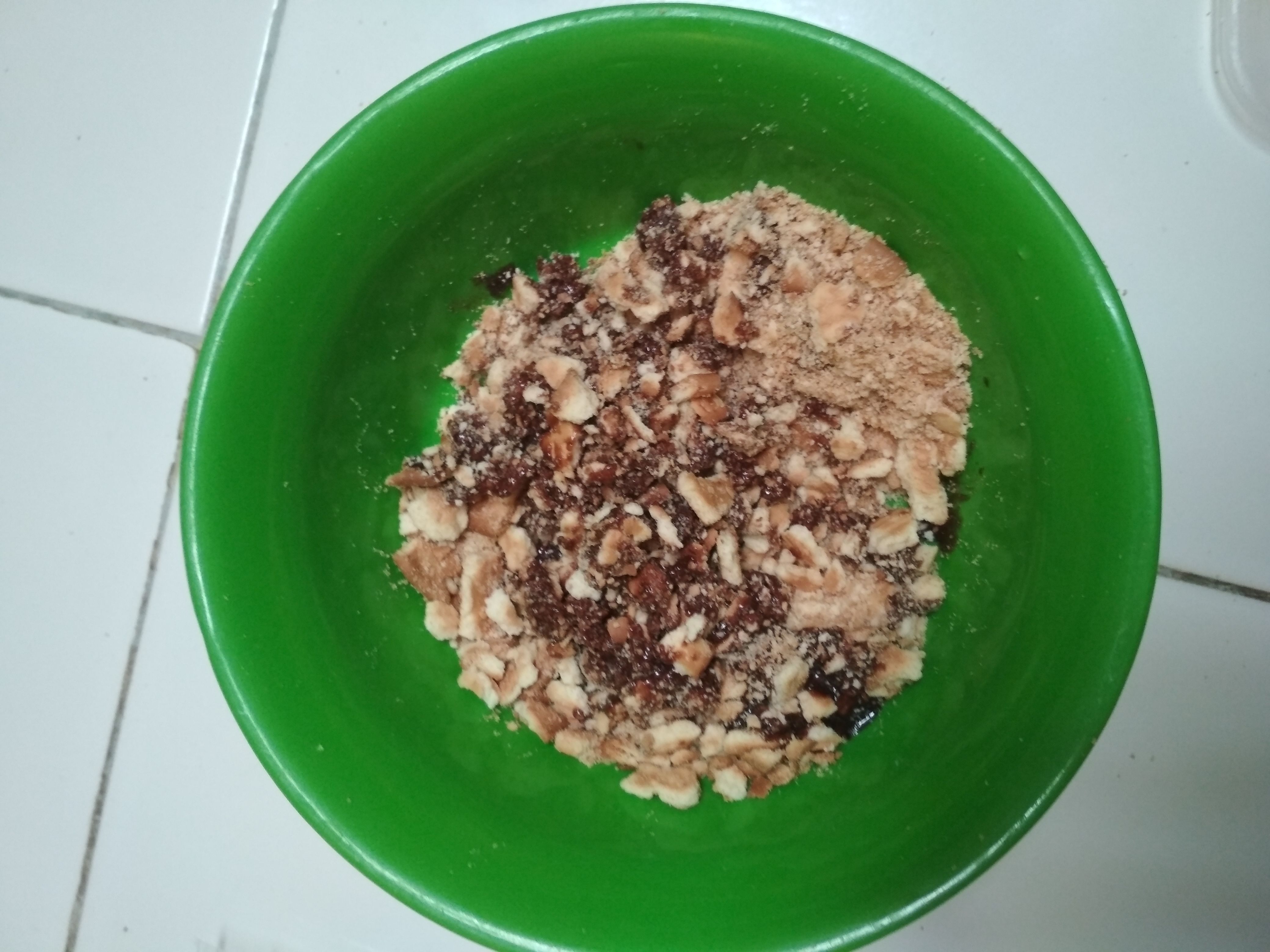 Setelah roti dihancurkan masukkan susu coklat kedalamnya aduk hingga merata
