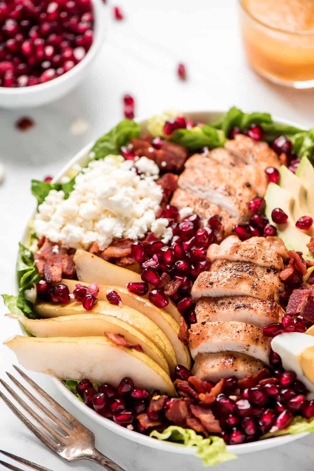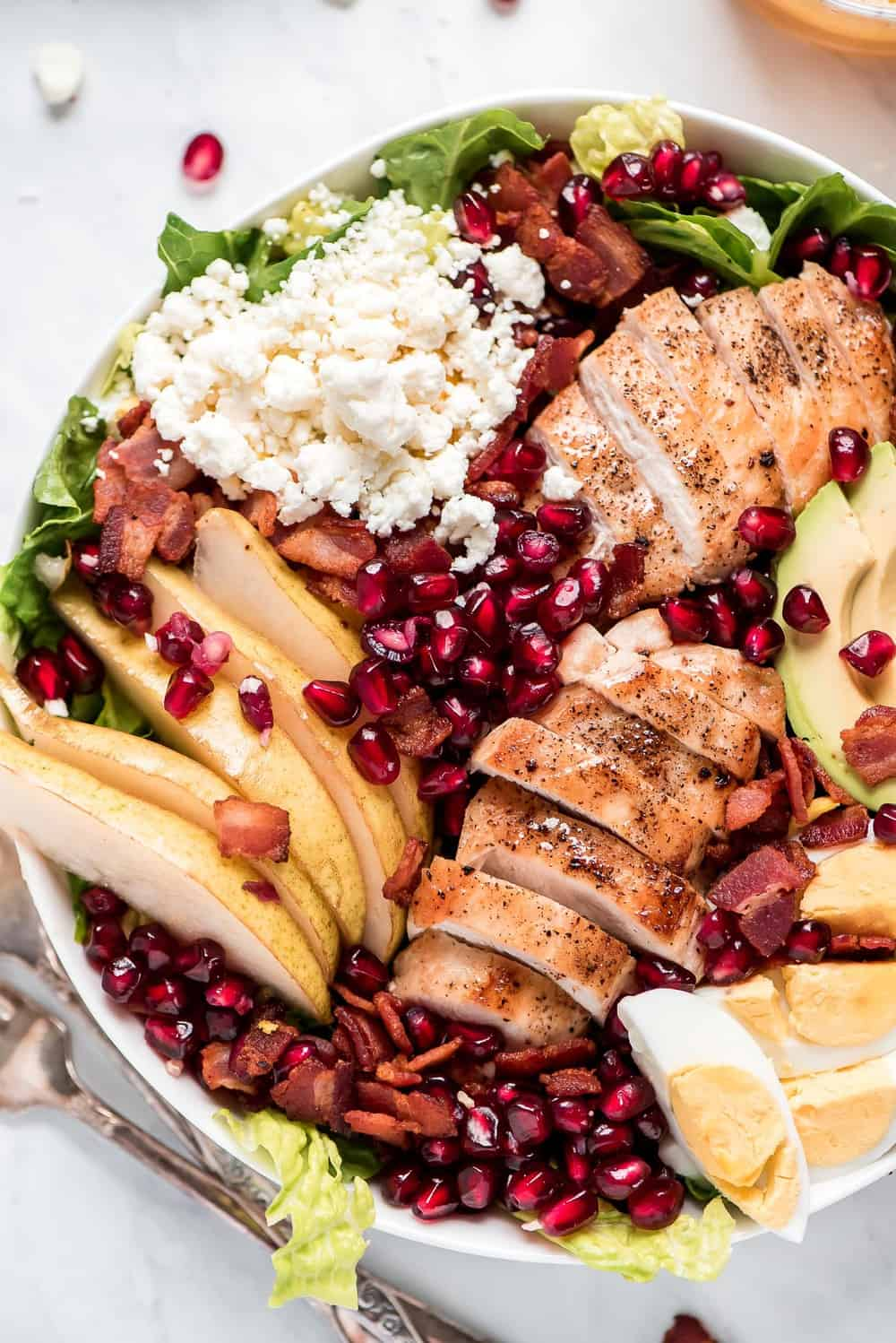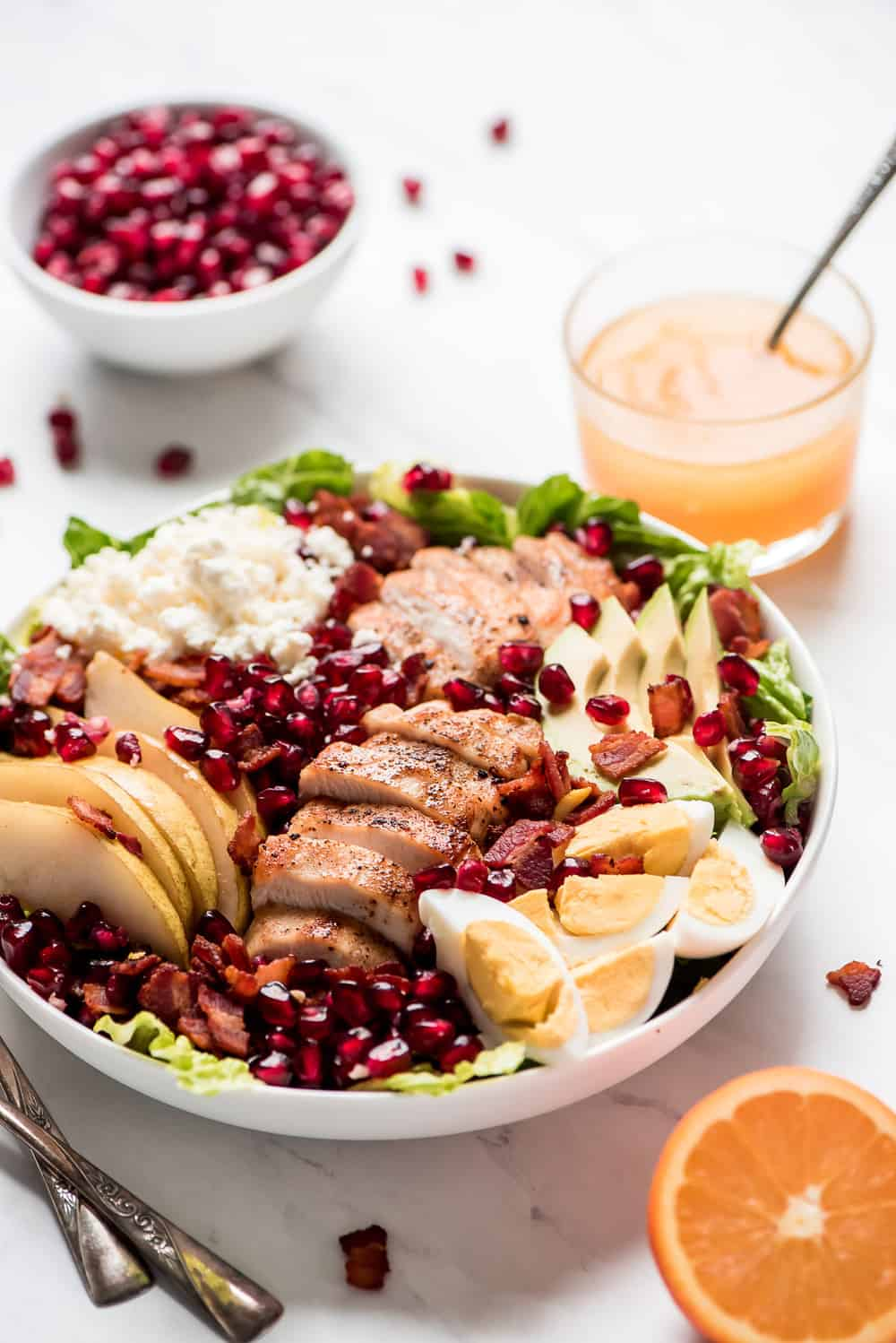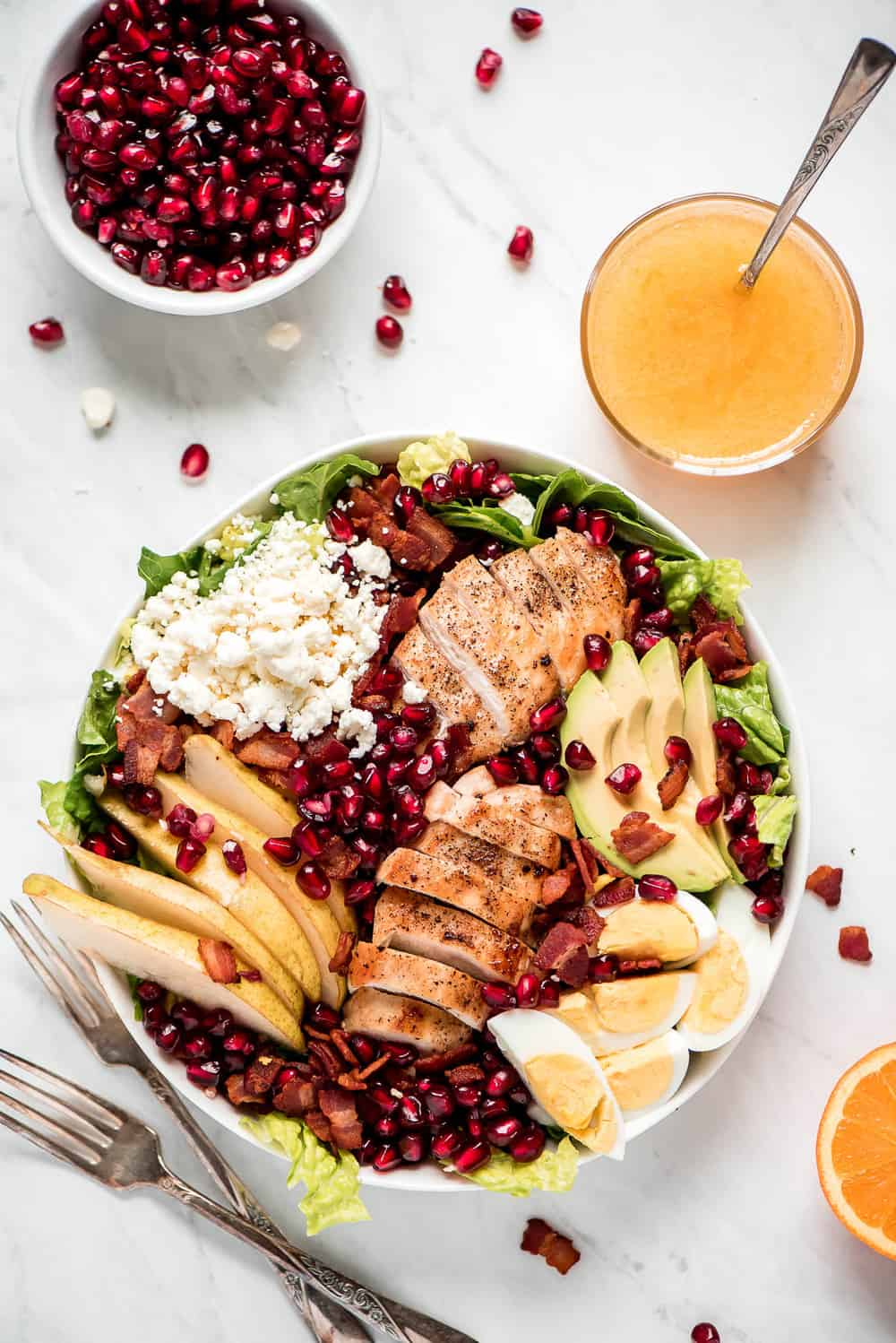 Hi friends! I am here to share a delicious and filling salad with you. Salads are a great way to fit more nutrient rich foods into your diet. This Winter Cobb Salad is full of winter fruits as well as the classics of a cobb salad. If you weren’t a salad person already, this is sure to turn you into one.