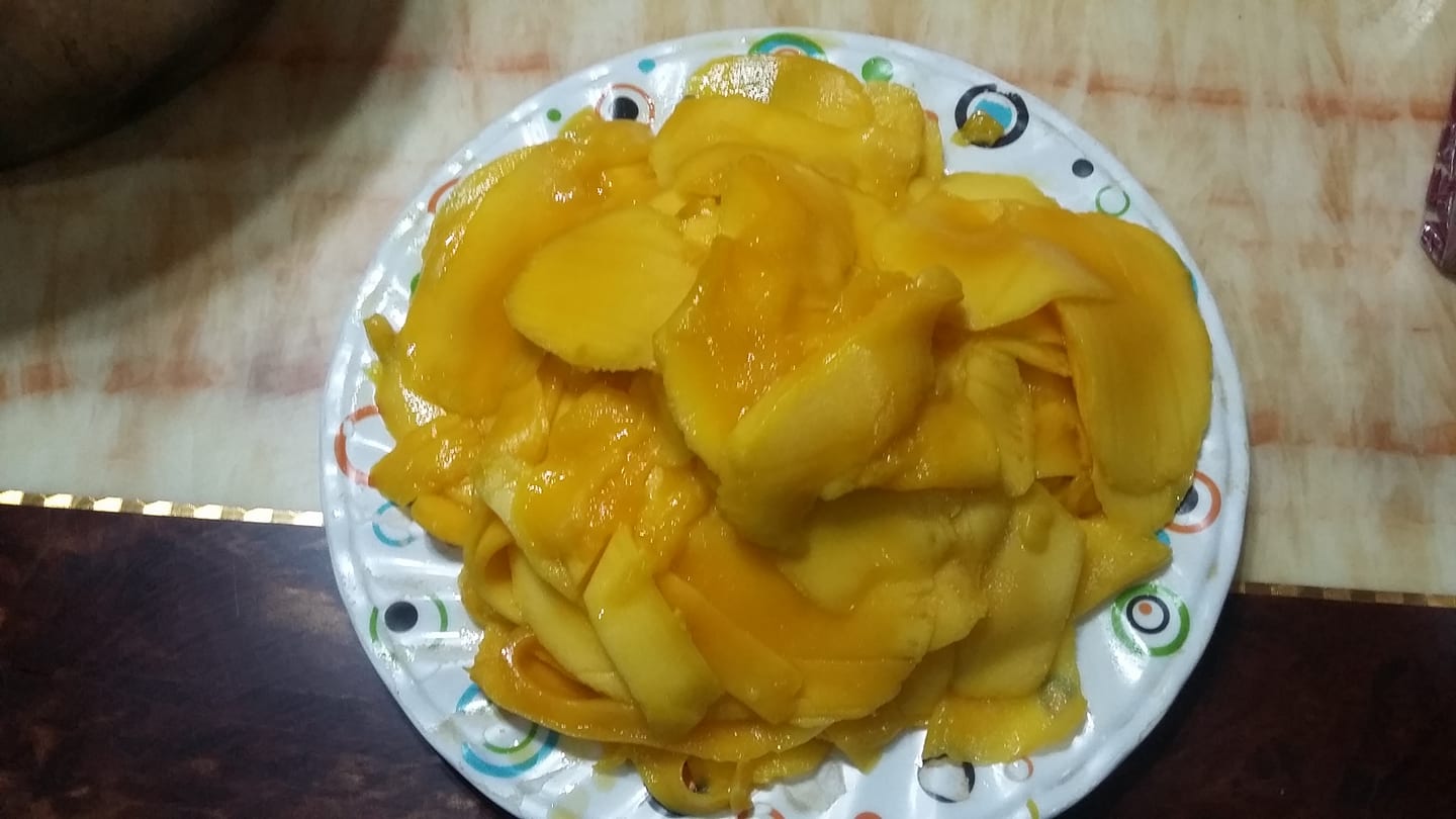 - Peel the Mangoes and cut it into thinner slices. Be careful in slicing to avoid injuries
